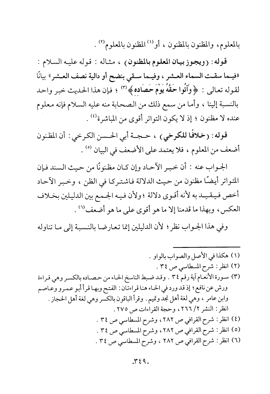 قوله: (ويجوز بيان المعلوم بالمظنون)، مثاله: قوله عليه السلام: "فيما سقت السماء العشر، وفيما سقي بنضح أو دالية نصف العشر" بيانًا لقوله تعالى: {وَآتُوا حَقَّهُ يَوْمَ حَصَادِهِ} (٣)؛ فإن هذا الحديث خبر واحد بالنسبة إلينا، وأما من سمع ذلك من الصحابة منه عليه السلام فإنه معلوم عنده لا مظنون؛ إذ لا يكون التواتر أقوى من المباشرة (٤).