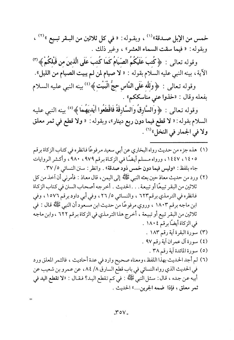وقوله تعالى: {وَالسَّارِقُ وَالسَّارِقَةُ فَاقْطَعُوا أَيْدِيَهُمَا} (٥) بينه النبي عليه السلام بقوله: "لا قطع فيما دون ربع دينار"، وبقوله: "ولا قطع في ثمر معلق ولا في الجمار في النخل" (٦).