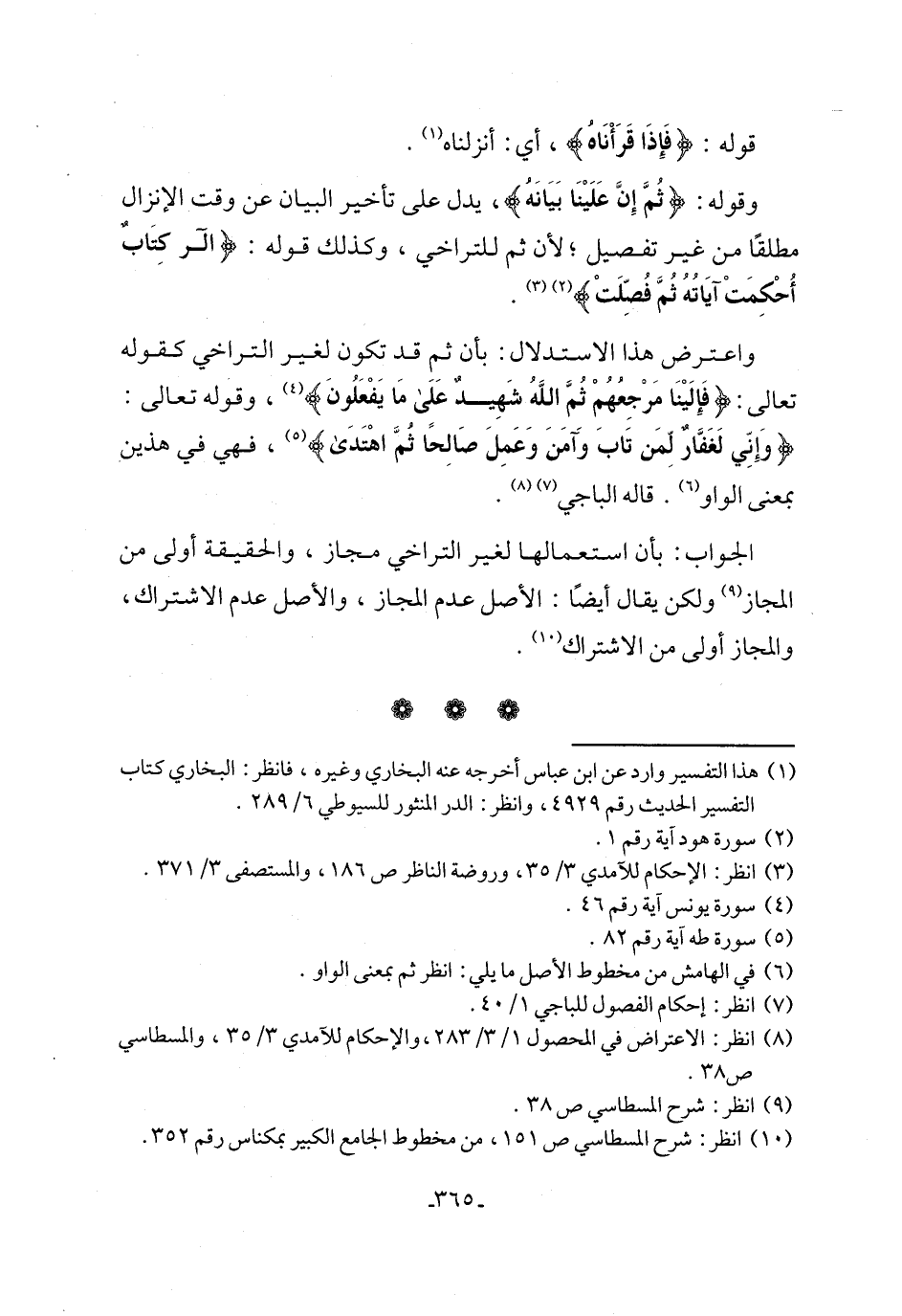 الجواب: بأن استعمالها لغير التراخي مجاز، والحقيقة أولى من المجاز (٩) ولكن يقال أيضًا: الأصل عدم المجاز، والأصل عدم الاشتراك، والمجاز أولى من الاشتراك (١٠).