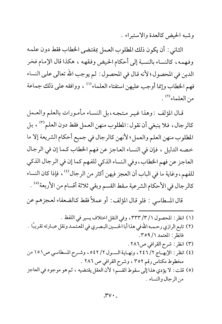 قال المؤلف: وهذا غير متجه، بل النساء مأمورات بالعلم والعمل كالرجال، فلا ينبغي أن نقول: المطلوب منهن العمل فقط دون العلم (٣)، بل المطلوب منهن العلم والعمل؛ لأنهن كالرجال في جميع أحكام الشريعة إلا ما خصه الدليل، فإن في النساء العاجز عن فهم الخطاب كما إن في الرجال العاجز عن فهم الخطاب، وفي النساء الذكي للفهم كما إن في الرجال الذكي للفهم، وغاية ما في الباب أن العجز فيهن أكثر من الرجال (٤)، فإذا كان النساء كالرجال في الأحكام الشرعية سقط القسم وبقي ثلاثة أقسام من الأربعة (٥).