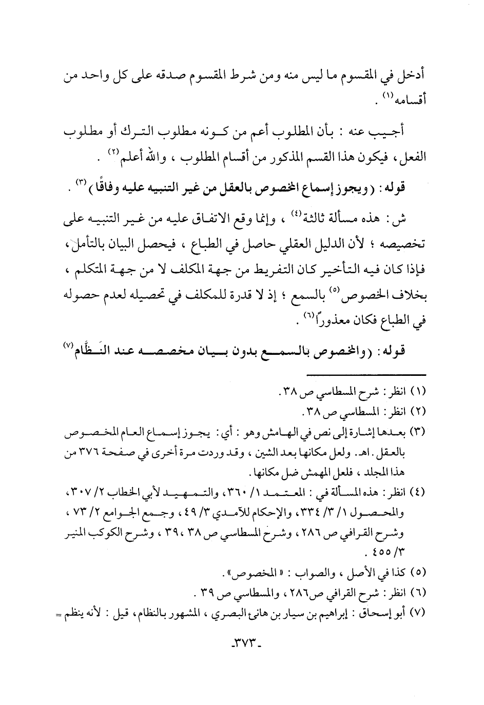 (٣) بعدها إشارة إلى نص في الهامش وهو: أي: يجوز إسماع العام المخصوص بالعقل. اهـ. ولعل مكانها بعد الشين، وقد وردت مرة أخرى في صفحة ٣٧٦ من هذا المجلد، فلعل المهمش ضل مكانها.