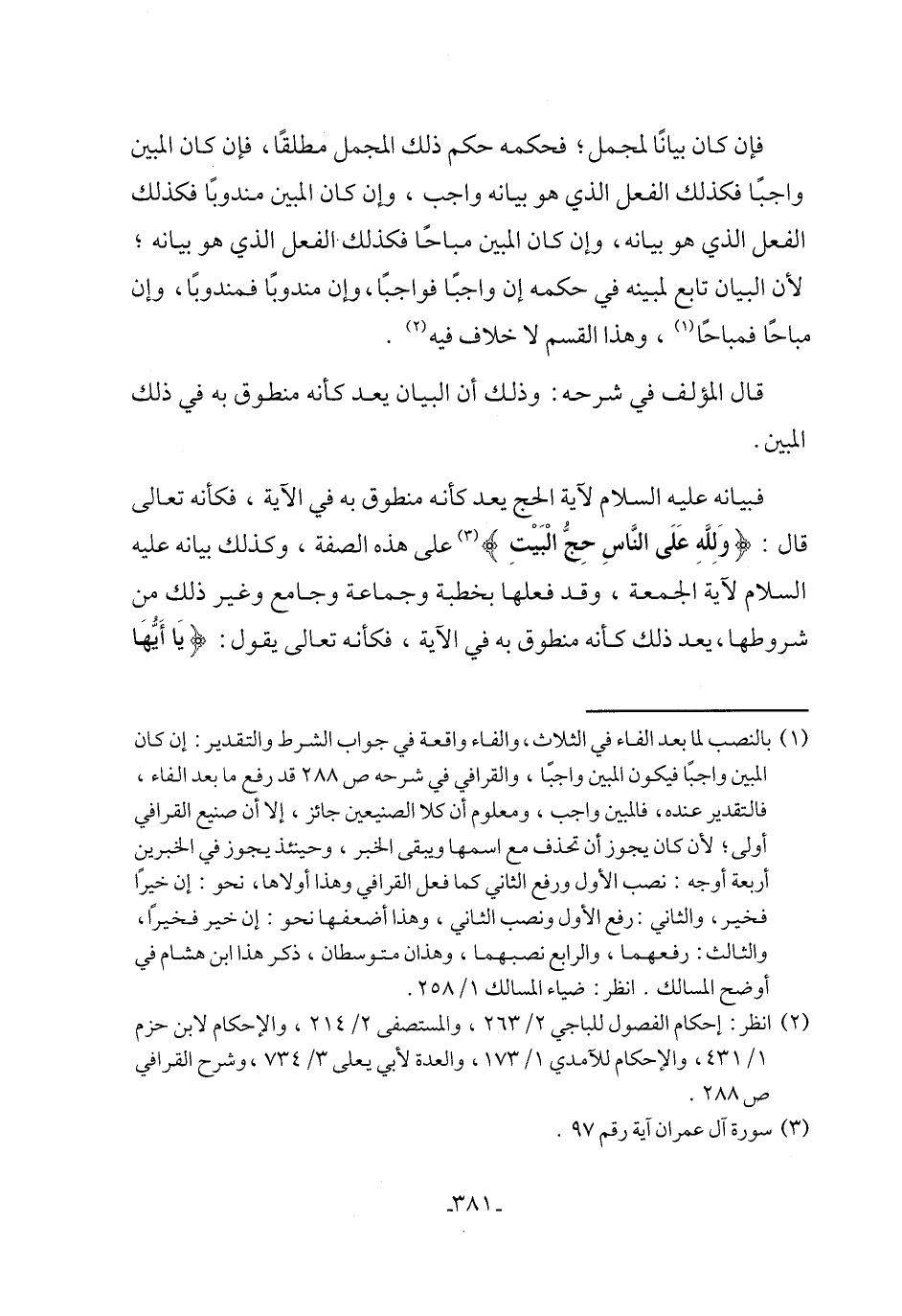 (١) بالنصب لما بعد الفاء في الثلاث، والفاء واقعة في جواب الشرط والتقدير: إن كان المبين واجبًا فيكون المبين واجبًا، والقرافي في شرحه ص ٢٨٨ قد رفع ما بعد الفاء، فالتقدير عنده، فالمبين واجب، ومعلوم أن كلا الصنيعين جائز، إلا أن صنيع القرافي أولى؛ لأن كان يجوز أن تحذف مع اسمها ويبقى الخبر، وحينئذ يجوز في الخبرين أربعة أوجه: نصب الأول ورفع الثاني كما فعل القرافي وهذا أولاها، نحو: إن خيرًا فخير، والثاني: رفع الأول ونصب الثاني، وهذا أضعفها نحو: إن خير فخيرًا، والثالث: رفعهما، والرابع نصبهما، وهذان متوسطان، ذكر هذا ابن هشام في أوضح المسالك. انظر: ضياء المسالك ١/ ٢٥٨.