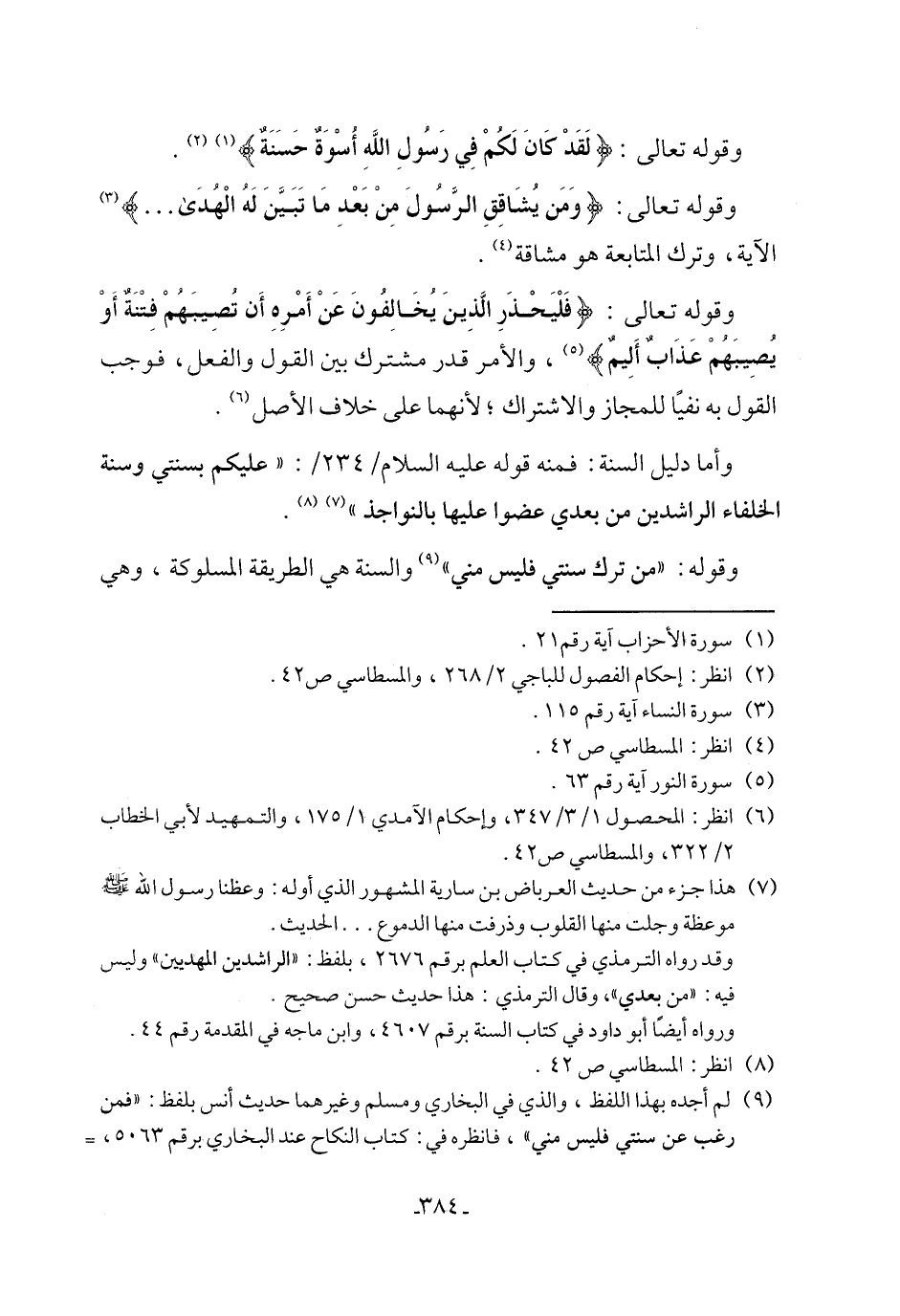 وأما دليل السنة: فمنه قوله عليه السلام/ ٢٣٤/: "عليكم بسنتي وسنة الخلفاء الراشدين من بعدي عضوا عليها بالنواجذ" (٧) (٨).