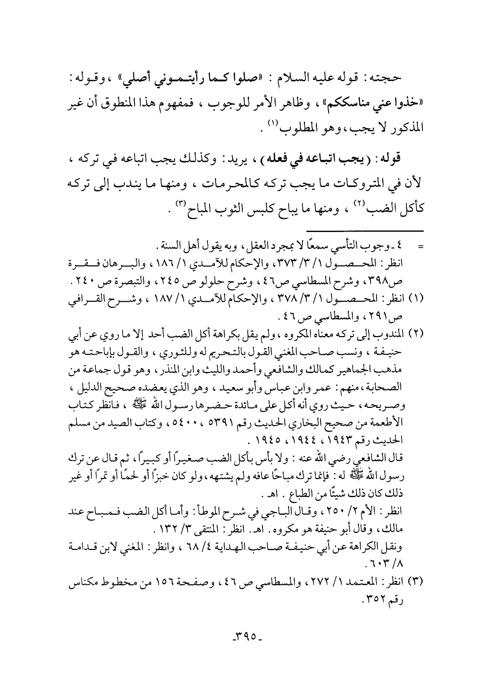 قوله: (يجب اتباعه في فعله)، يريد: وكذلك يجب اتباعه في تركه، لأن في المتروكات ما يجب تركه كالمحرمات، ومنها ما يندب إلى تركه كأكل الضب (٢)، ومنها ما يباح كلبس الثوب المباح (٣).