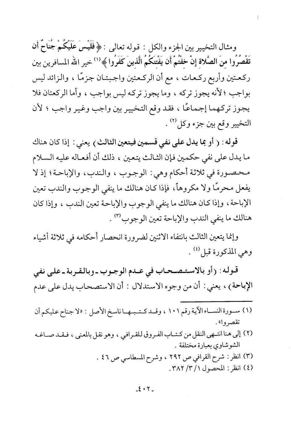 ومثال التخيير بين الجزء والكل: قوله تعالى: {فَلَيْسَ عَلَيْكُمْ جُنَاحٌ أَنْ تَقْصُرُوا مِنَ الصَّلَاةِ إِنْ خِفْتُمْ أَنْ يَفْتِنَكُمُ الَّذِينَ كَفَرُوا} (١) خير الله المسافرين بين ركعتين وأربع ركعات، مع أن الركعتين واجبتان جزمًا، والزائد ليس بواجب؛ لأنه يجوز تركه، وما يجوز تركه ليس بواجب، وأما الركعتان فلا يجوز تركهما إجماعًا، فقد وقع التخيير بين واجب وغير واجب؛ لأن التخيير وقع بين جزء وكل (٢).