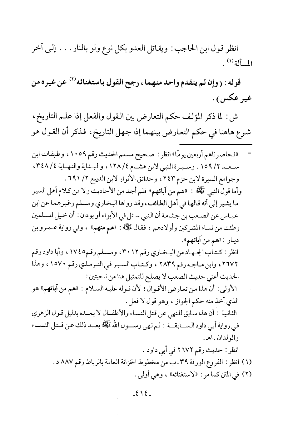 الثانية: أن هذا سابق للنهي عن قتل النساء والأطفال لا بعده بدليل قول الزهري في رواية أبي داود السابقة: ثم نهى رسول الله - صلى الله عليه وسلم - بعد ذلك عن قتل النساء والولدان. اهـ.