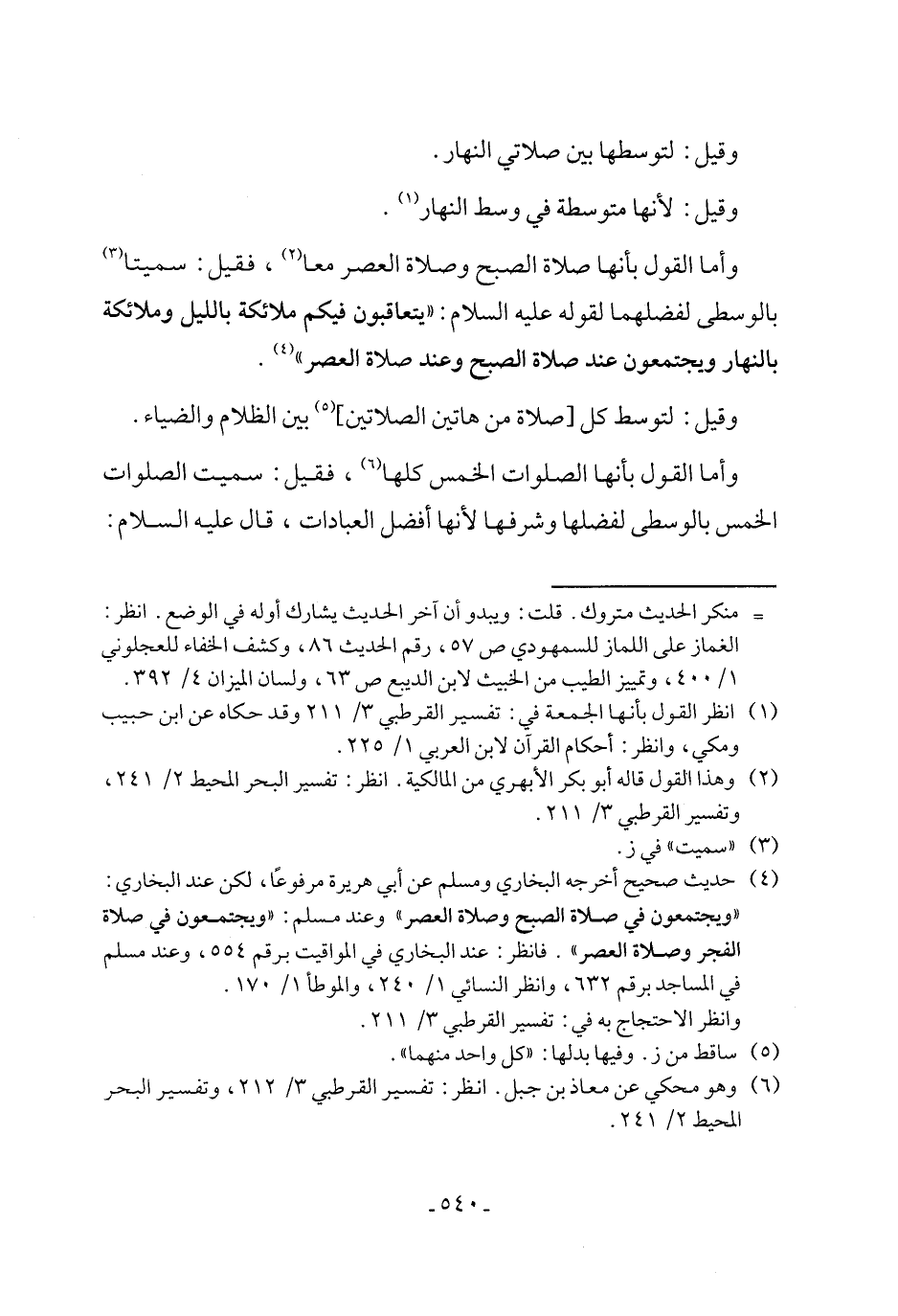 وأما القول بأنها الصلوات الخمس كلها (٦)، فقيل: سميت الصلوات الخمس بالوسطى لفضلها وشرفها لأنها أفضل العبادات، قال عليه السلام: