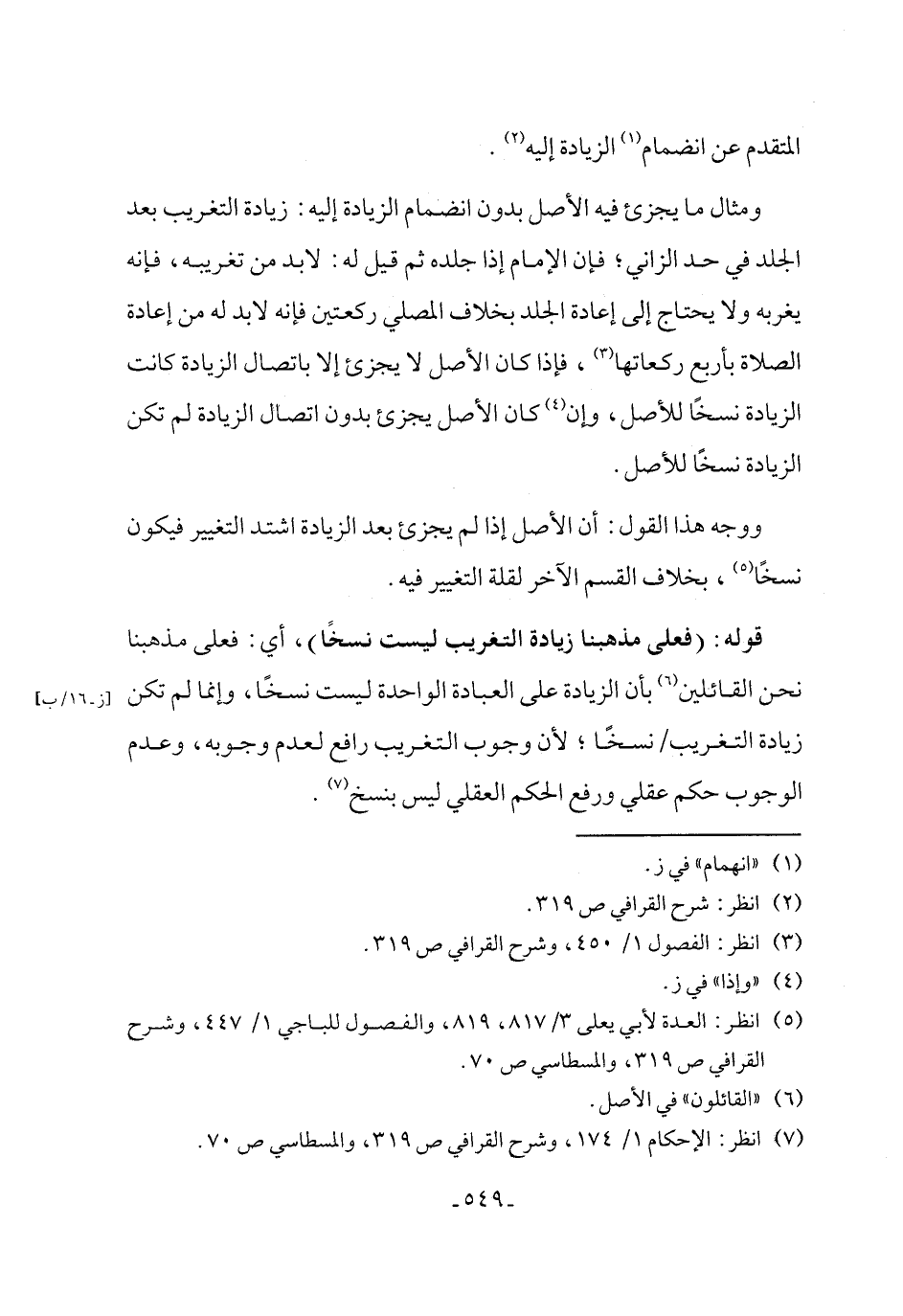 ومثال ما يجزئ فيه الأصل بدون انضمام الزيادة إليه: زيادة التغريب بعد الجلد في حد الزاني؛ فإن الإمام إذا جلده ثم قيل له: لا بد من تغريبه، فإنه يغربه ولا يحتاج إلى إعادة الجلد بخلاف المصلي ركعتين فإنه لا بد له من إعادة الصلاة بأربع ركعاتها (٣)، فإذا كان الأصل لا يجزئ إلا باتصال الزيادة كانت الزيادة نسخًا للأصل، وإن (٤) كان الأصل يجزئ بدون اتصال الزيادة لم تكن الزيادة نسخًا للأصل.