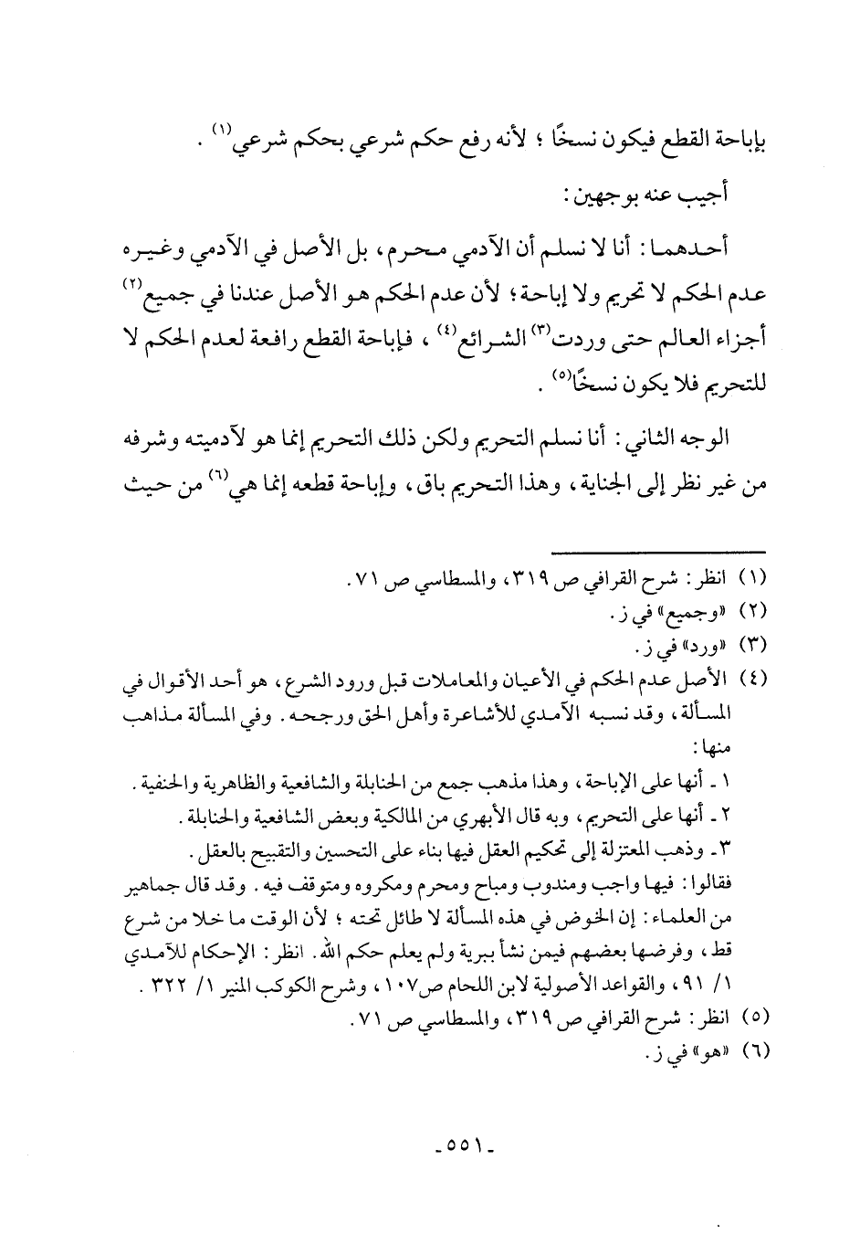 الوجه الثاني: أنا نسلم التحريم ولكن ذلك التحريم إنما هو لآدميته وشرفه من غير نظر إلى الجناية، وهذا التحريم باق، وإباحة قطعه إنما هي (٦) من حيث