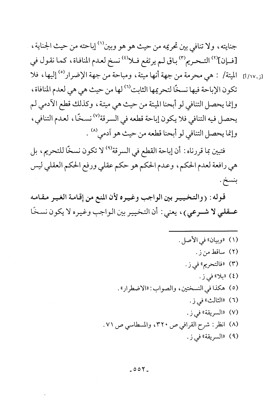 فتبين بما قررناه: أن إباحة القطع في السرقة (٩) لا تكون نسخًا للتحريم، بل هي رافعة لعدم الحكم، وعدم الحكم هو حكم عقلي ورفع الحكم العقلي ليس بنسخ.