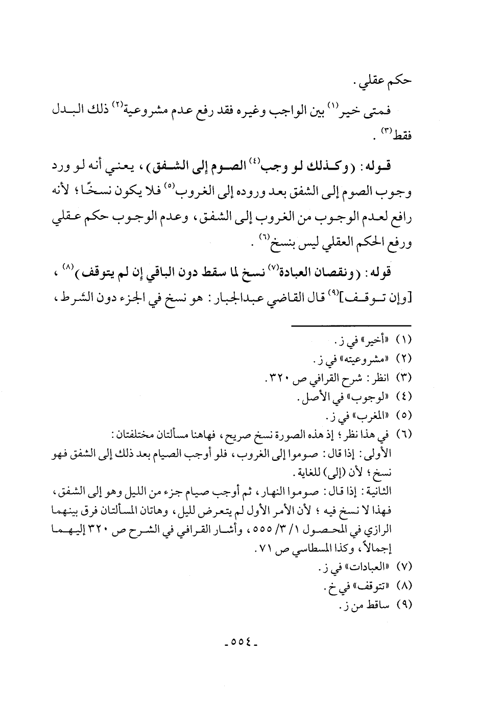 قوله: (ونقصان العبادة (٧) نسخ لما سقط دون الباقي إِن لم يتوقف) (٨)، [وإن توقف] (٩) قال القاضي عبد الجبار: هو نسخ في الجزء دون الشرط،