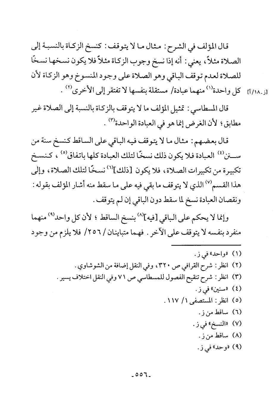 قال المؤلف في الشرح: مثال ما لا يتوقف: كنسخ الزكاة بالنسبة إلى الصلاة مثلاً، يعني: أنه إذا نسخ وجوب الزكاة مثلاً فلا يكون نسخها نسخًا للصلاة لعدم توقف الباقي وهو الصلاة على وجود المنسوخ وهو الزكاة لأن كل واحدة (١) منهما عبادة مستقلة بنفسها لا تفتقر إلى الأخرى (٢).