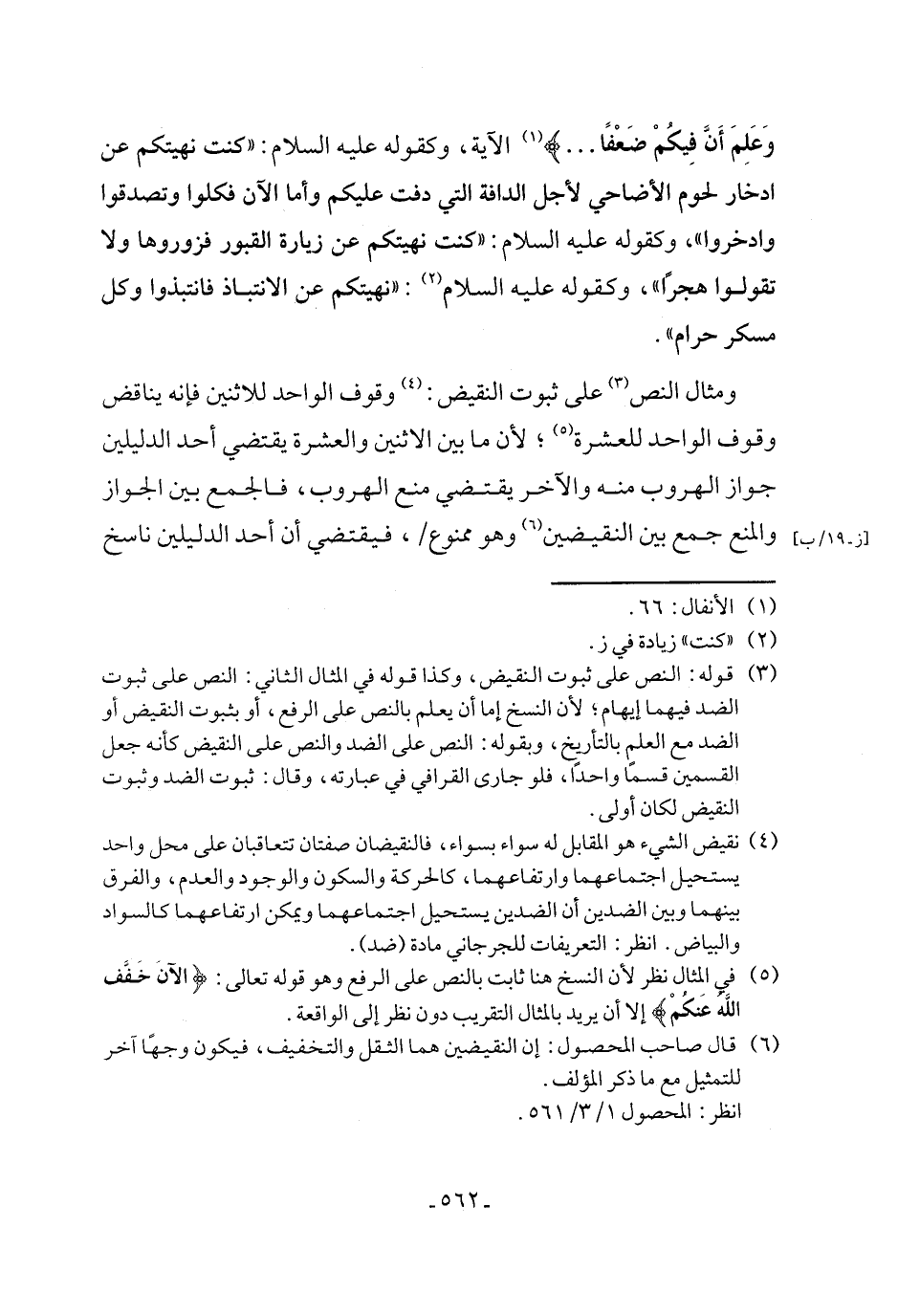 (٣) قوله: النص على ثبوت النقيض، وكذا قوله في المثال الثاني: النص على ثبوت الضد فيهما إيهام؛ لأن النسخ إما أن يعلم بالنص على الرفع، أو بثبوت النقيض أو الضد مع العلم بالتأريخ، وبقوله: النص على الضد والنص على النقيض كأنه جعل القسمين قسمًا واحدًا، فلو جارى القرافي في عبارته، وقال: ثبوت الضد وثبوت النقيض لكان أولى.