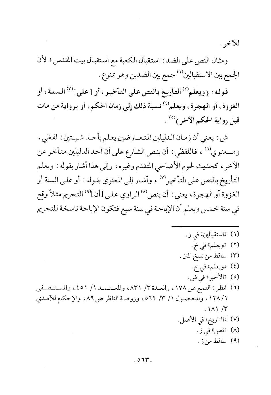 قوله: (ويعلم (٢) التأريخ بالنص على التأخير، أو [على] (٣) السنة، أو الغزوة، أو الهجرة، ويعلم (٤) نسبة ذلك إِلى زمان الحكم، أو برواية من مات قبل رواية الحكم الآخر) (٥).