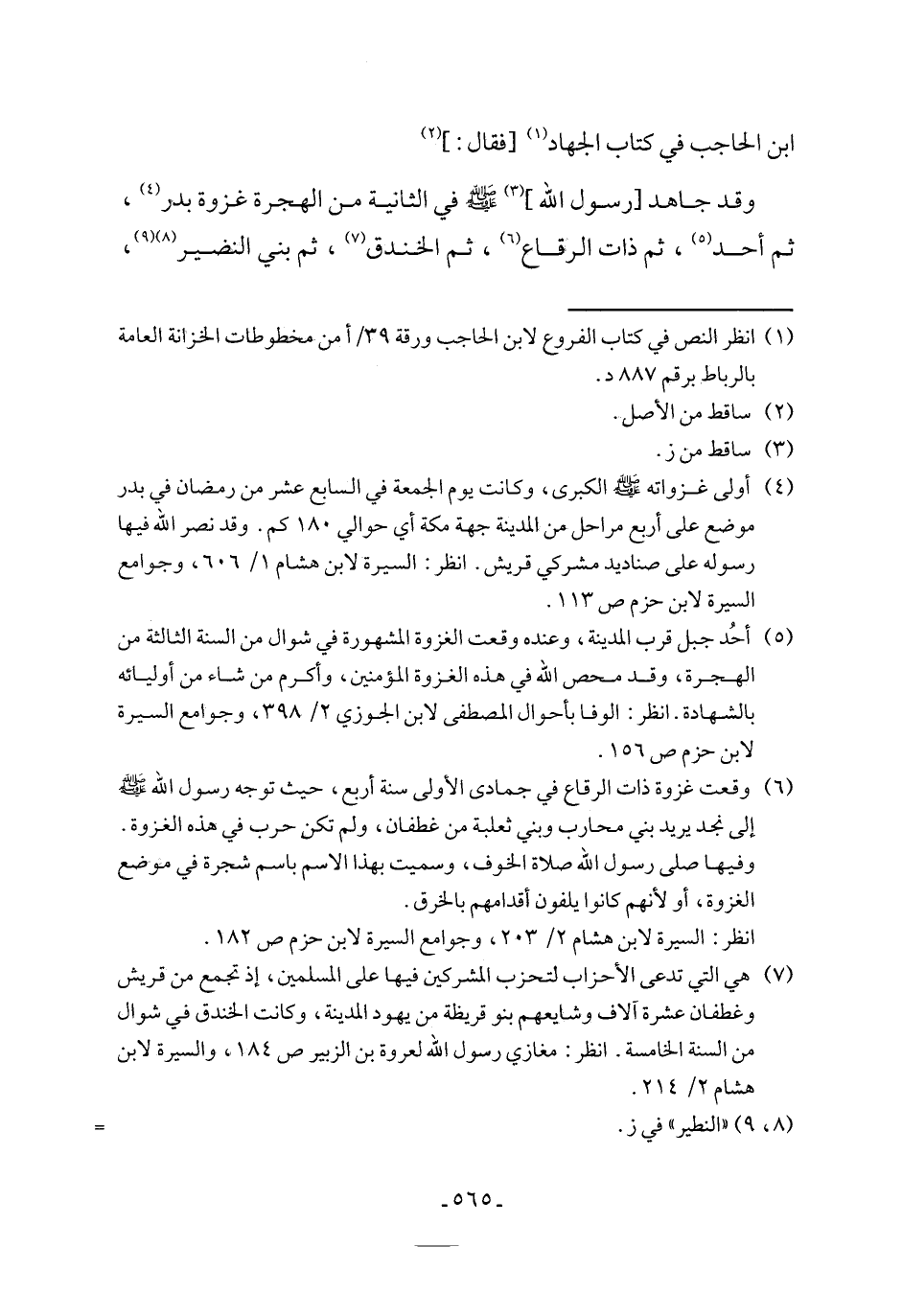 وقد جاهد [رسول الله] (٣) - صلى الله عليه وسلم - في الثانية من الهجرة غزوة بدر (٤) , ثم أحد (٥)، ثم ذات الرقاع (٦)، ثم الخندق (٧)، ثم بني النضير (٨) (٩) ,
