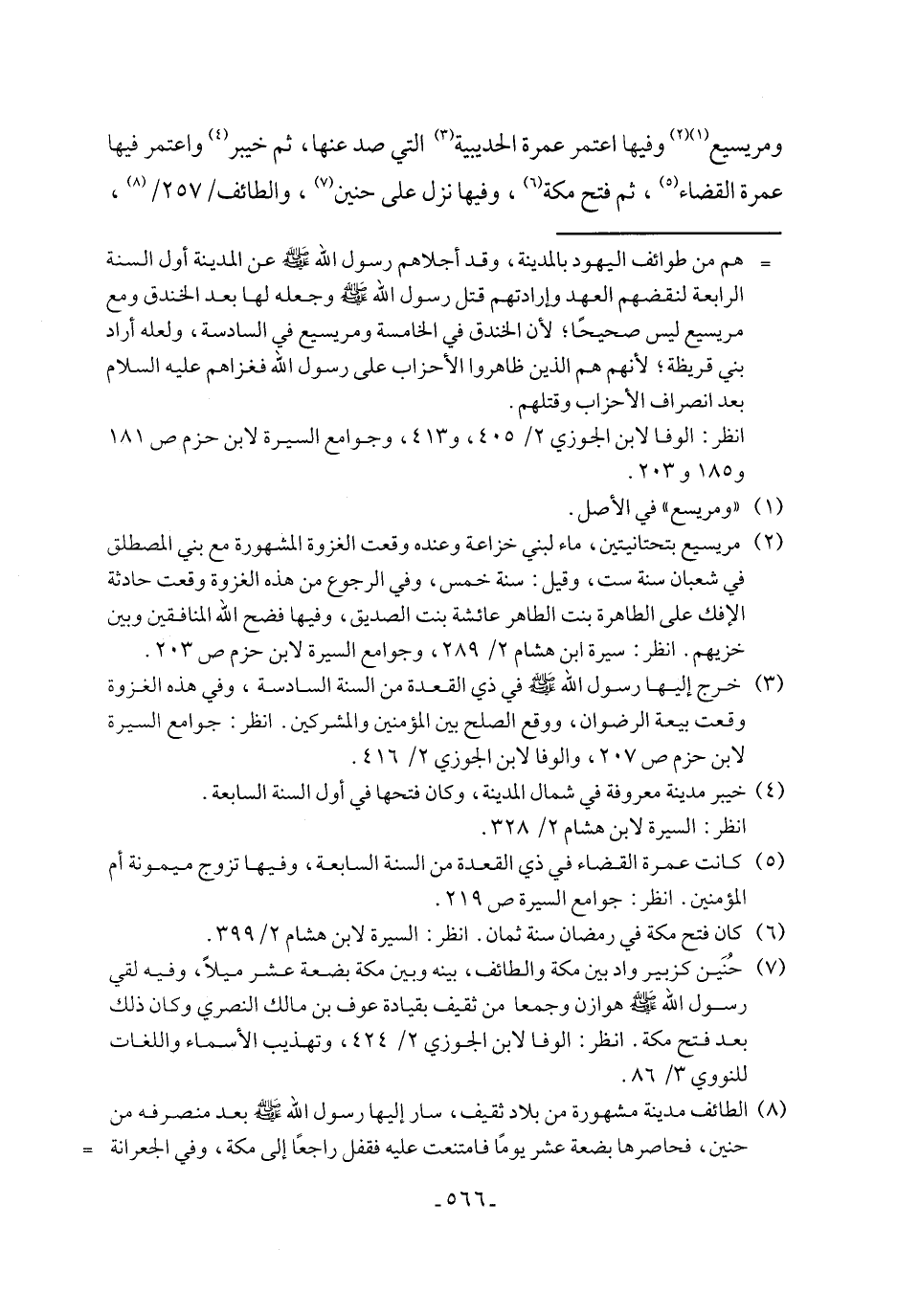 ومريسيع (١) (٢) وفيها اعتمر عمرة الحديبية (٣) التي صد عنها، ثم خيبر (٤) واعتمر فيها عمرة القضاء (٥)، ثم فتح مكة (٦)، وفيها نزل على حنين (٧)، والطائف/ ٢٥٧/ (٨)،