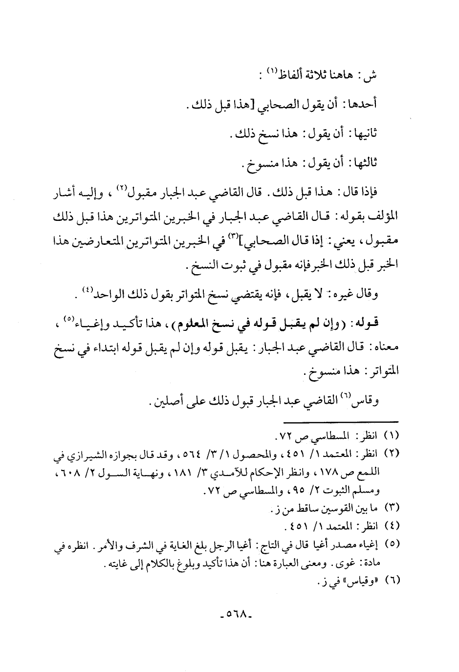 قوله: (وإِن لم يقبل قوله في نسخ المعلوم)، هذا تأكيد وإغياء (٥)، معناه: قال القاضي عبد الجبار: يقبل قوله وإن لم يقبل قوله ابتداء في نسخ المتواتر: هذا منسوخ.