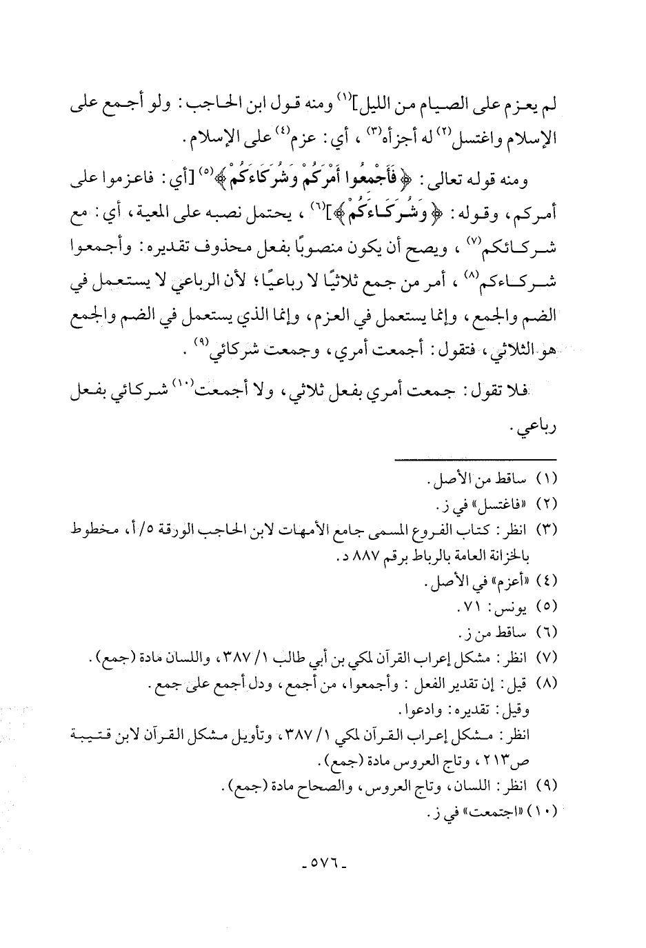 ومنه قوله تعالى: {فَأَجْمِعُوا أَمْرَكُمْ وَشُرَكَاءَكُمْ} (٥) [أي: فاعزموا على أمركم، وقوله: {وَشُرَكَاءَكُمْ}] (٦)، يحتمل نصبه على المعية، أي: مع شركائكم (٧)، ويصح أن يكون منصوبًا بفعل محذوف تقديره: وأجمعوا شركاءكم (٨)، أمر من جمع ثلاثيًا لا رباعيًا؛ لأن الرباعي لا يستعمل في الضم والجمع، وإنما يستعمل في العزم، وإنما الذي يستعمل في الضم والجمع هو الثلاثي، فتقول: أجمعت أمري، وجمعت شركائي (٩).