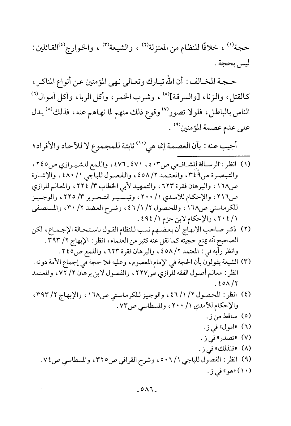 حجة المخالف: أن الله تبارك وتعالى نهى المؤمنين عن أنواع المناكر، كالقتل، والزنا، [والسرقة] (٥)، وشرب الخمر، وأكل الربا، وأكل أموال (٦) الناس بالباطل، فلولا تصور (٧) وقوع ذلك منهم لما نهاهم عنه، فذلك (٨) يدل على عدم عصمة المؤمنين (٩).