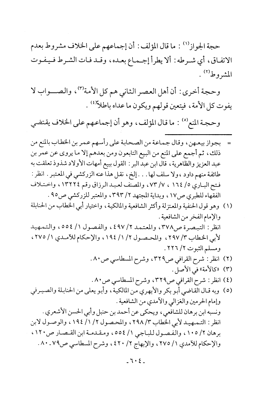 وحجة أخرى: أن أهل العصر الثاني هم كل الأمة (٣)، والصواب لا يفوت كل الأمة، فيتعين قولهم ويكون ما عداه باطلاً (٤).