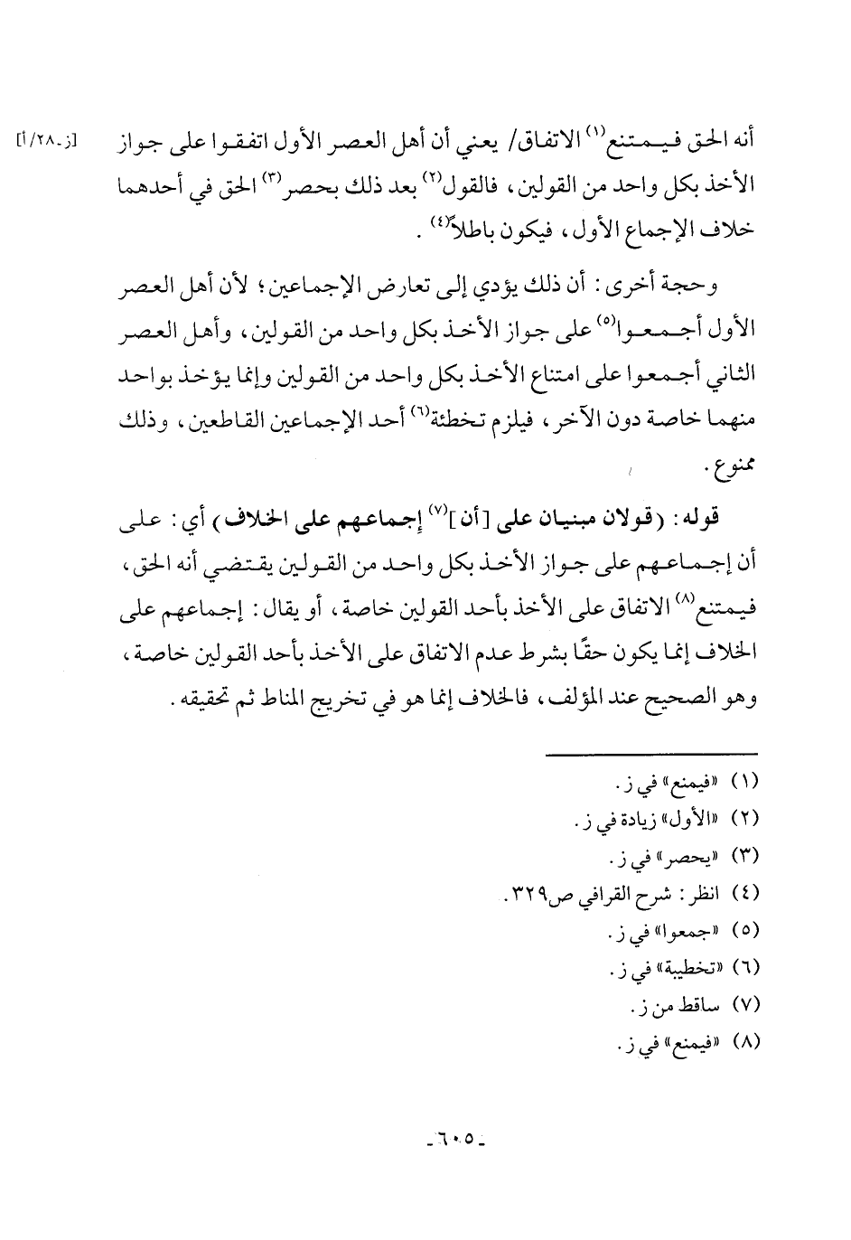 وحجة أخرى: أن ذلك يؤدي إلى تعارض الإجماعين؛ لأن أهل العصر الأول أجمعوا (٥) على جواز الأخذ بكل واحد من القولين، وأهل العصر الثاني أجمعوا على امتناع الأخذ بكل واحد من القولين وإنما يؤخذ بواحد منهما خاصة دون الآخر، فيلزم تخطئة (٦) أحد الإجماعين القاطعين، وذلك ممنوع.