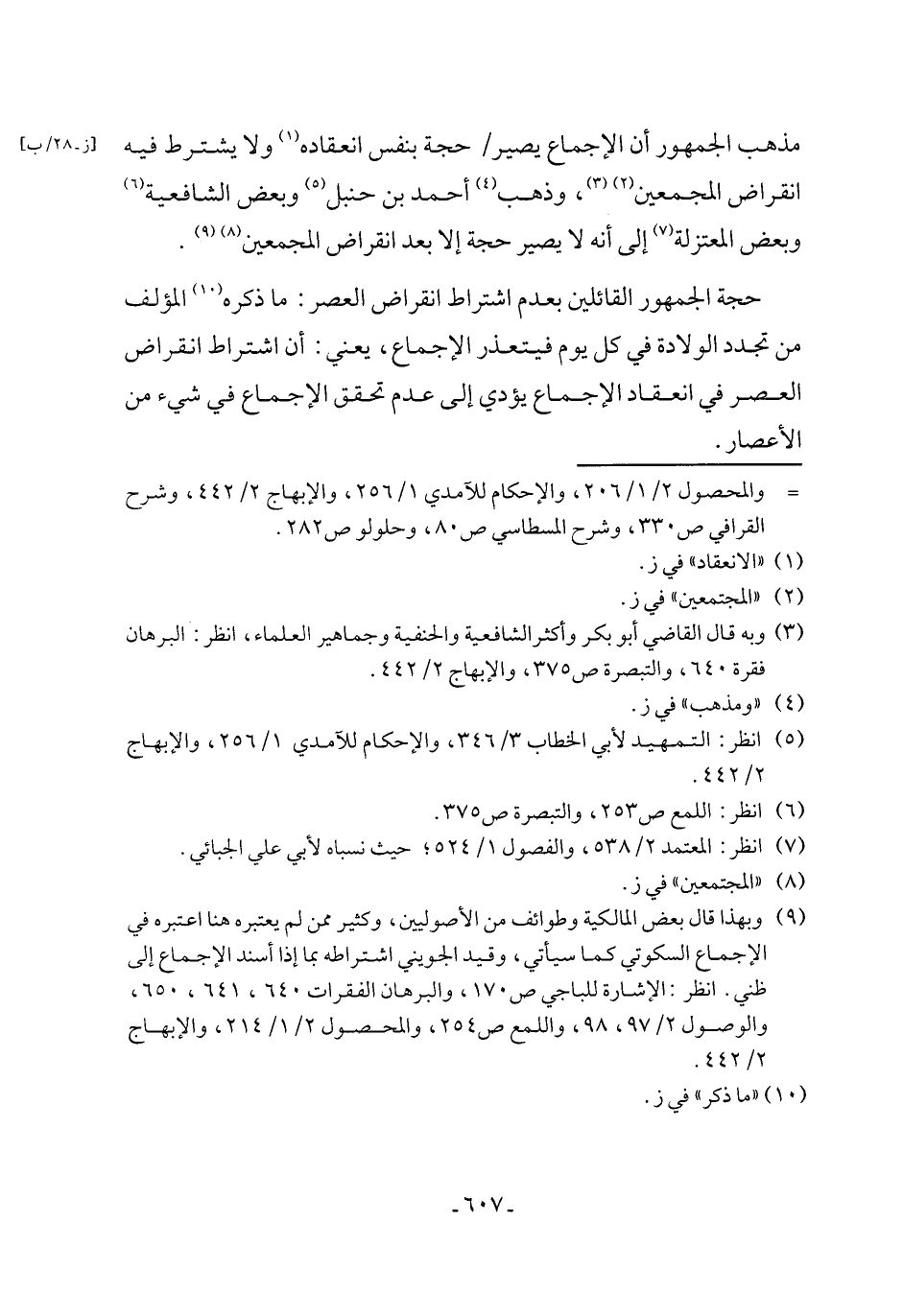 حجة الجمهور القائلين بعدم اشتراط انقراض العصر: ما ذكره (١٠) المؤلف من تجدد الولادة في كل يوم فيتعذر الإجماع، يعني: أن اشتراط انقراض العصر في انعقاد الإجماع يؤدي إلى عدم تحقق الإجماع في شيء من الأعصار.