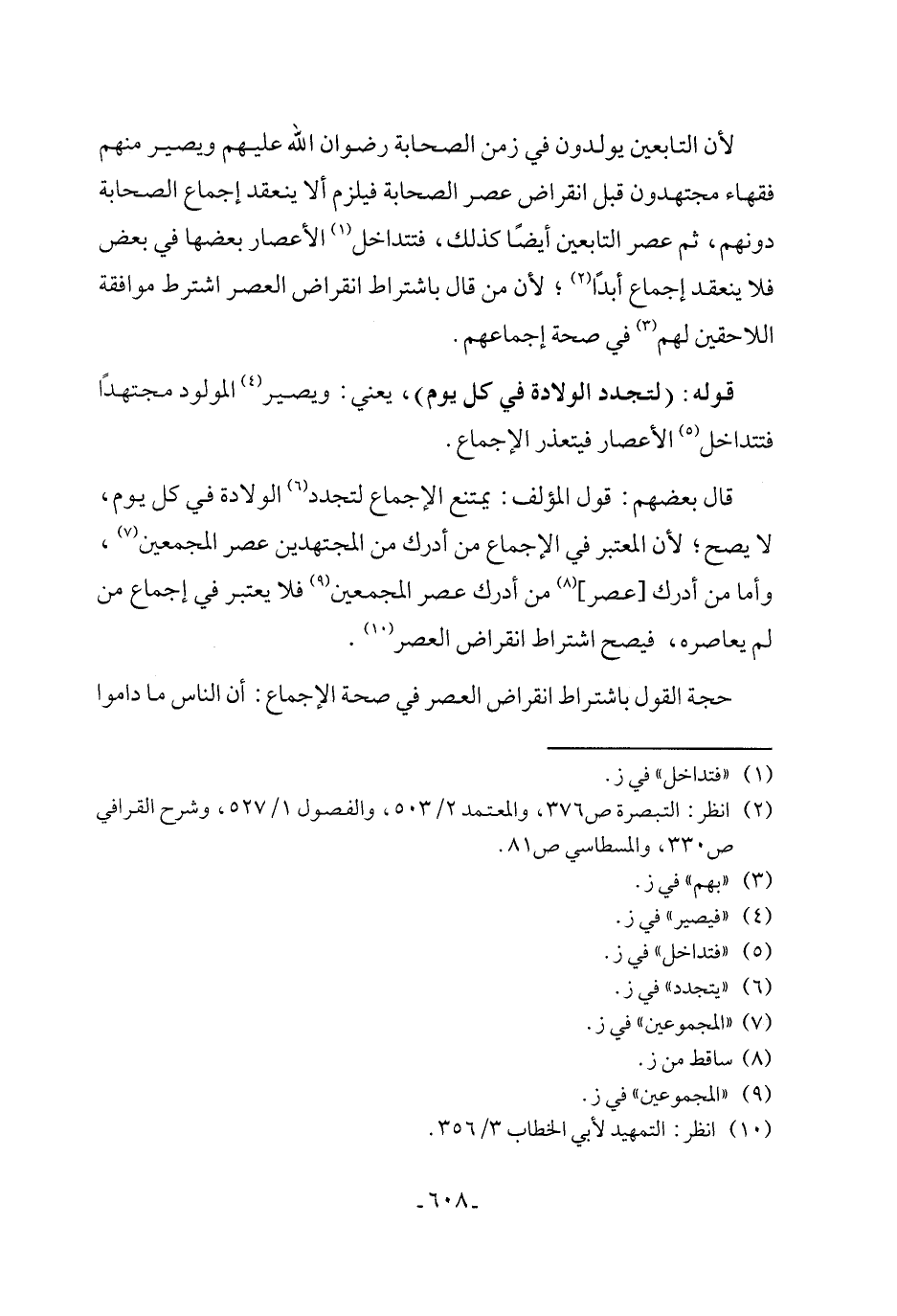قوله: (لتجدد الولادة في كل يوم)، يعني: ويصير (٤) المولود مجتهدًا فتتداخل (٥) الأعصار فيتعذر الإجماع.