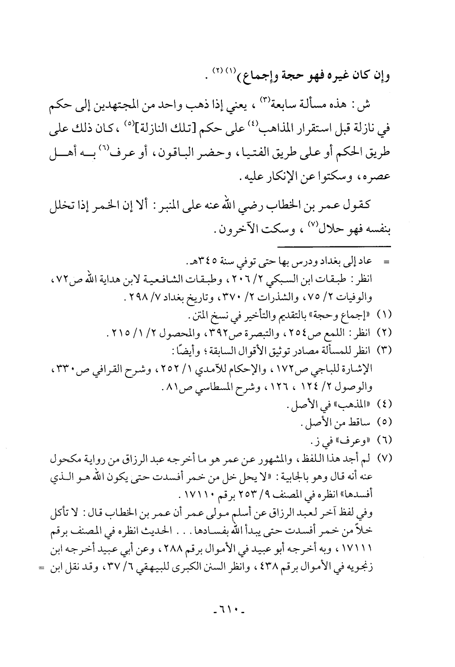 ش: هذه مسألة سابعة (٣)، يعني إذا ذهب واحد من المجتهدين إلى حكم في نازلة قبل استقرار المذاهب (٤) على حكم [تلك النازلة] (٥)، كان ذلك على طريق الحكم أو على طريق الفتيا، وحضر الباقون، أو عرف (٦) به أهل عصره، وسكتوا عن الإنكار عليه.
