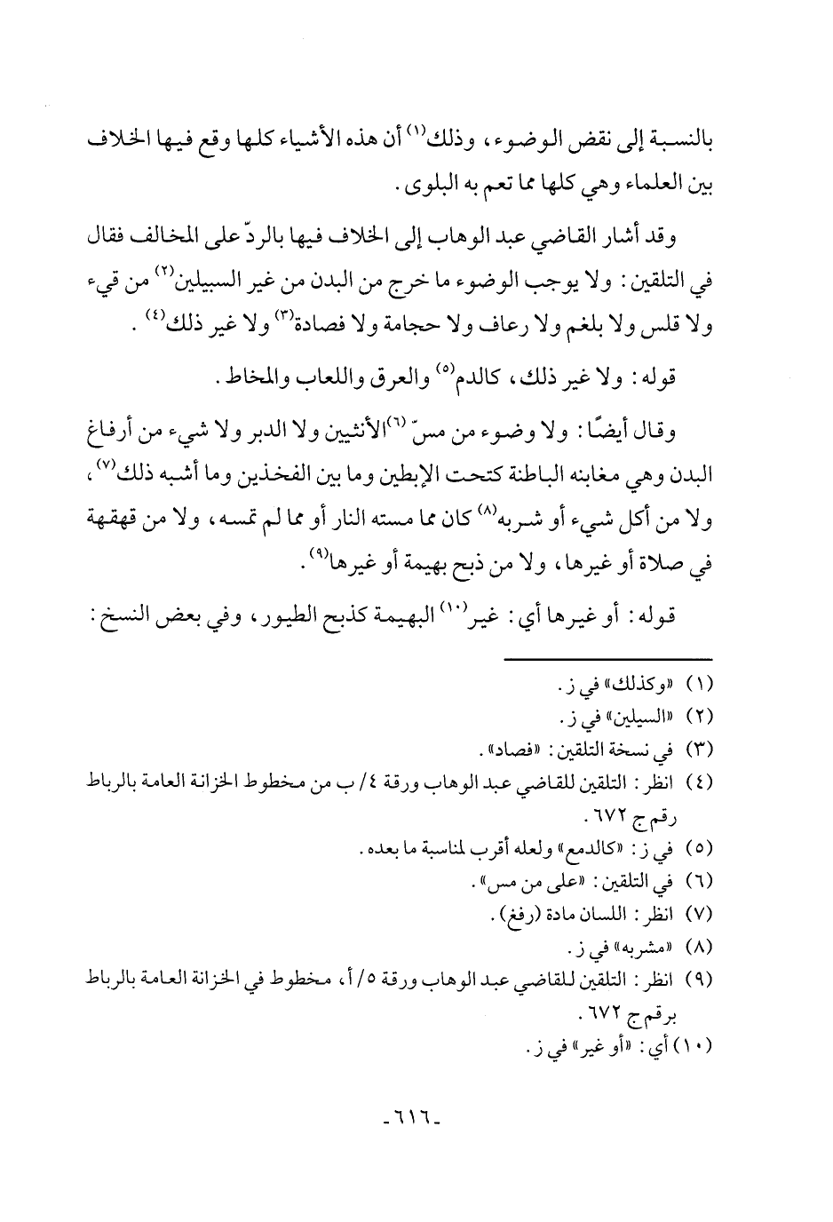 (٩) انظر: التلقين للقاضي عبد الوهاب ورقة ٥/ أ، مخطوط في الخزانة العامة بالرباط برقم ج ٦٧٢.