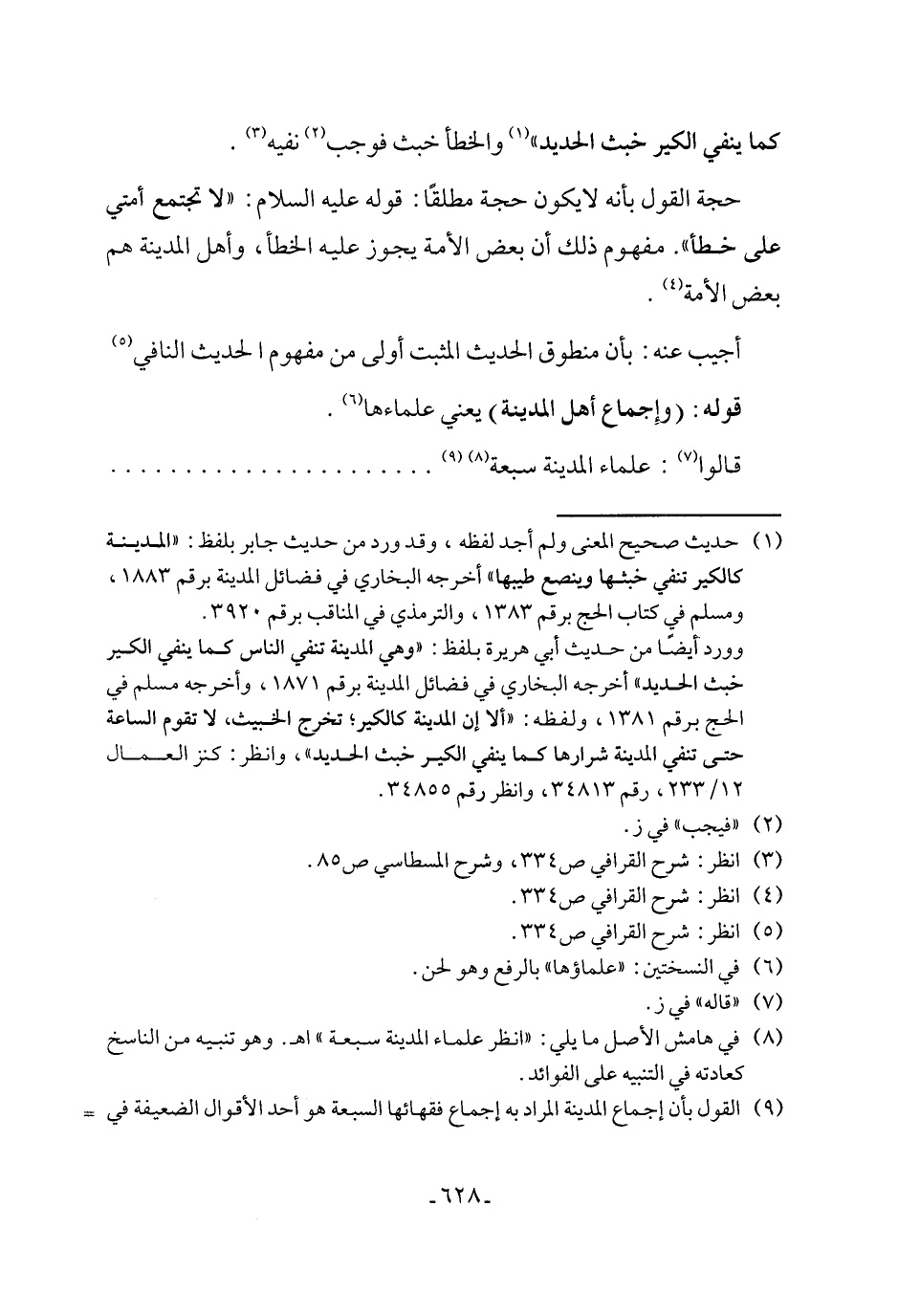 حجة القول بأنه لا يكون حجة مطلقًا: قوله عليه السلام: "لا تجتمع أمتي على خطأ". مفهوم ذلك أن بعض الأمة يجوز عليه الخطأ، وأهل المدينة هم بعض الأمة (٤).