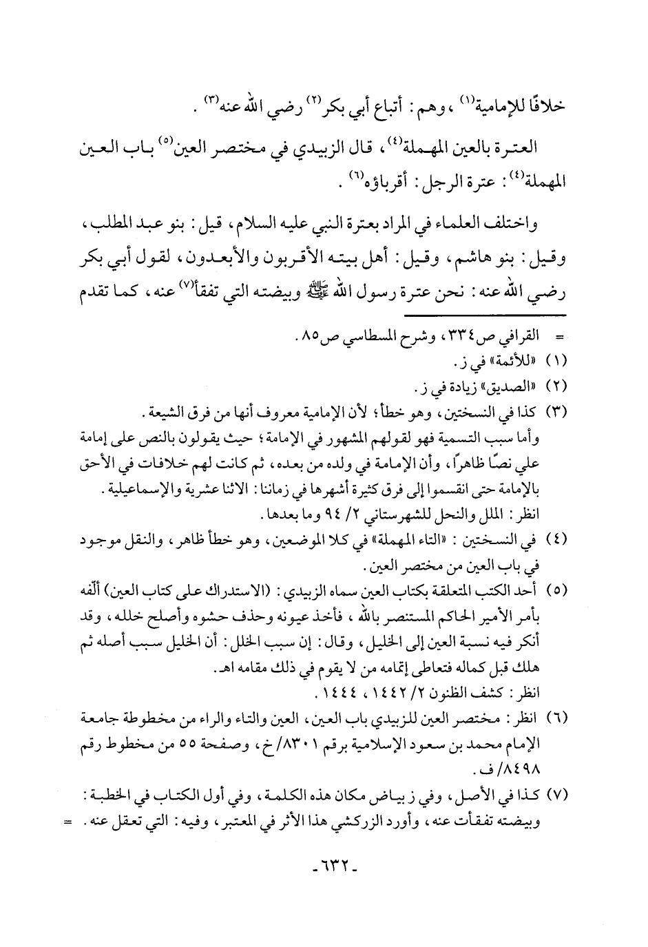 واختلف العلماء في المراد بعترة النبي عليه السلام، قيل: بنو عبد المطلب، وقيل: بنو هاشم، وقيل: أهل بيته الأقربون والأبعدون، لقول أبي بكر رضي الله عنه: نحن عترة رسول الله - صلى الله عليه وسلم - وبيضته التي تفقأ (٧) عنه، كما تقدم