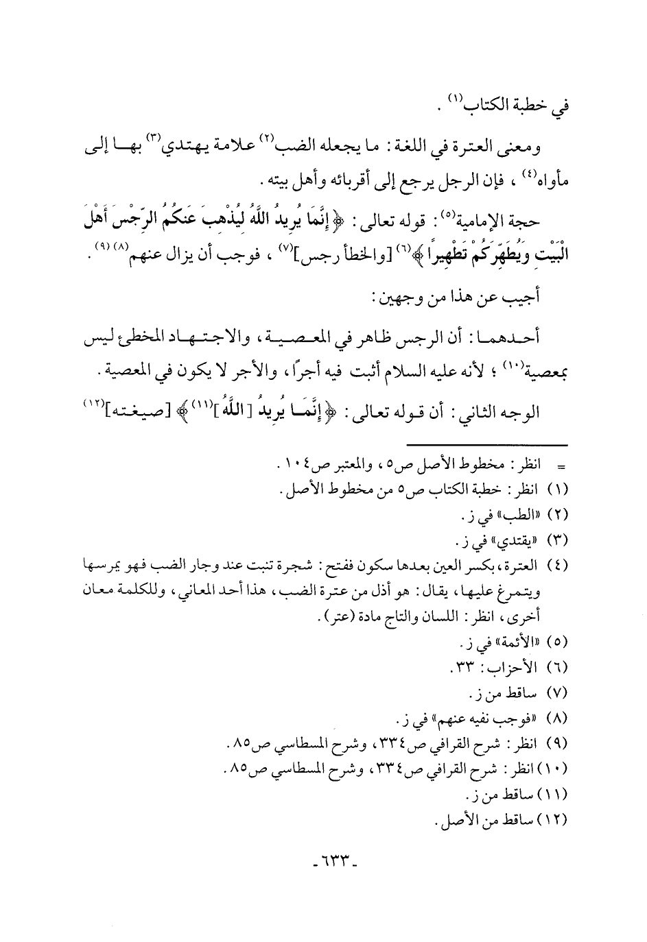 حجة الإمامية (٥): قوله تعالى: {إِنَّمَا يُرِيدُ اللَّهُ لِيُذْهِبَ عَنْكُمُ الرِّجْسَ أَهْلَ الْبَيْتِ وَيُطَهِّرَكُمْ تَطْهِيرًا} (٦) [والخطأ رجس] (٧)، فوجب أن يزال عنهم (٨) (٩).