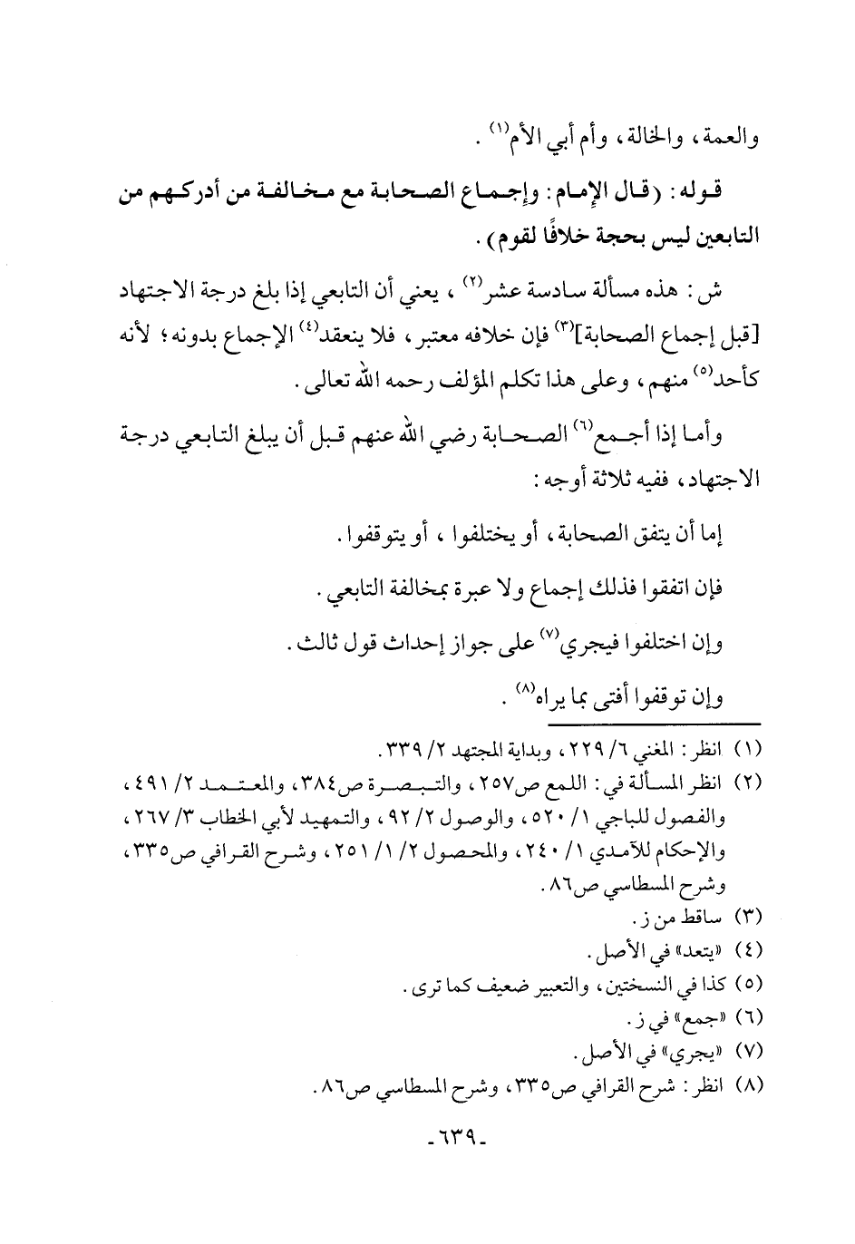 ش: هذه مسألة سادسة عشر (٢)، يعني أن التابعي إذا بلغ درجة الاجتهاد [قبل إجماع الصحابة] (٣) فإن خلافه معتبر، فلا ينعقد (٤) الإجماع بدونه؛ لأنه كأحد (٥) منهم، وعلى هذا تكلم المؤلف رحمه الله تعالى.
