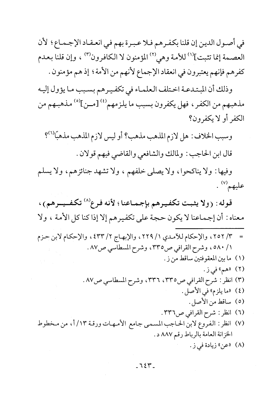 قوله: (ولا يثبت تكفيرهم بإِجماعنا؛ لأنه فرع (٨) تكفيرهم)، معناه: أن إجماعنا لا يكون حجة على تكفيرهم إلا إذا كنا كل الأمة، ولا