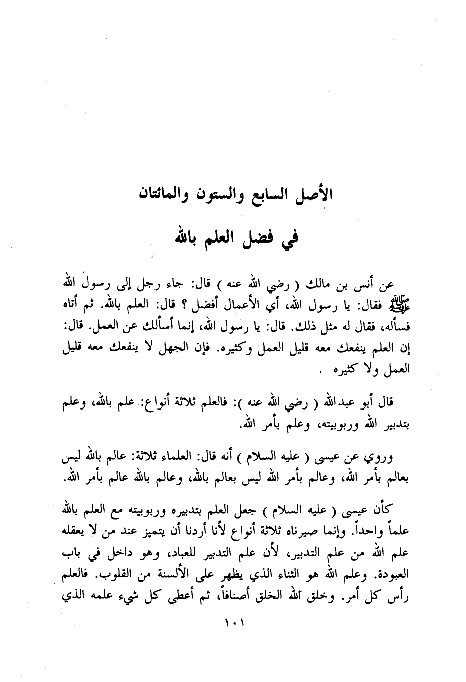 قَالَ أَبُو عبد الله رَضِي الله عَنهُ فالعلم ثَلَاثَة أَنْوَاع علم بِاللَّه وَعلم بتدبير الله وربوبيته وَعلم بِأَمْر الله