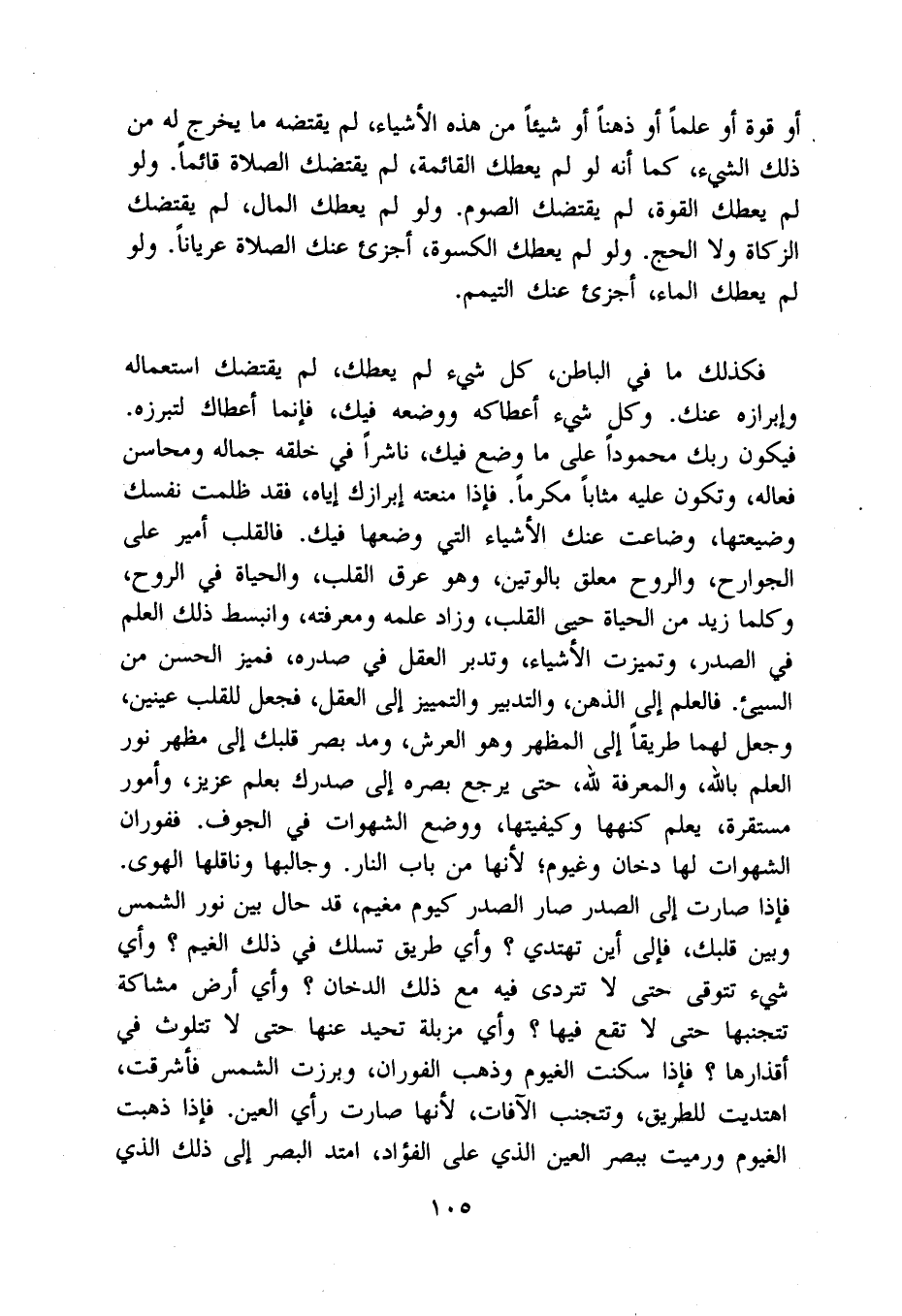 فَكَذَلِك مَا فِي الْبَاطِن كل شَيْء لم يعطك لم يقتضك اسْتِعْمَاله وإبرازه عَنْك وكل شَيْء أعطاكه وَوَضعه فِيك فَإِنَّمَا أَعْطَاك لتبرزه فَيكون رَبك مَحْمُودًا على مَا وضع فِيك ناشرا فِي خلقه جماله ومحاسن فعاله وَتَكون عَلَيْهِ مثابا مكرما فَإِذا منعته إبرازك إِيَّاه فقد ظلمت نَفسك وضيعتها وضاعت عَنْك الْأَشْيَاء الَّتِي وَضعهَا فِيك فالقلب أَمِير على الْجَوَارِح وَالروح مُعَلّق بالوتين وَهُوَ عرق الْقلب والحياة فِي الرّوح وَكلما زيد من الْحَيَاة حيى الْقلب وَزَاد علمه ومعرفته وانبسط ذَلِك الْعلم فِي الصَّدْر وتميزت الْأَشْيَاء وتدبر الْعقل فِي صَدره فميز الْحسن من السَّيئ فالعلم إِلَى الذِّهْن وَالتَّدْبِير والتمييز إِلَى الْعقل فَجعل للقلب عينين وَجعل لَهما طَرِيقا إِلَى الْمظهر وَهُوَ الْعَرْش وَمد بصر قَلْبك إِلَى مظهر نور الْعلم بِاللَّه والمعرفة لله حَتَّى يرجع بَصَره إِلَى صدرك بِعلم عَزِيز وَأُمُور مُسْتَقِرَّة يعلم كنهها وكيفيتها وَوضع الشَّهَوَات فِي الْجوف ففوران الشَّهَوَات لَهَا دُخان وغيوم لِأَنَّهَا من بَاب النَّار وجالبها وناقلها الْهوى فَإِذا صَارَت إِلَى الصَّدْر صَار الصَّدْر كَيَوْم مغيم قد حَال بَين نور الشَّمْس وَبَين قَلْبك فَإلَى أَيْن تهتدي وَأي طَرِيق تسلك فِي ذَلِك الْغَيْم وَأي شَيْء تتوقى حَتَّى لَا تتردى فِيهِ مَعَ ذَلِك الدُّخان وَأي أَرض مشاكة تتجنبها حَتَّى لَا تقع فِيهَا وَأي مزبلة تحيد عَنْهَا حَتَّى لَا تتلوث فِي أقذارها فَإِذا سكنت الغيوم وَذهب الفوران وبرزت الشَّمْس فأشرقت اهتديت للطريق وتتجنب الْآفَات لِأَنَّهَا صَارَت رَأْي الْعين فَإِذا ذهبت الغيوم ورميت ببصر الْعين الَّذِي على الْفُؤَاد امْتَدَّ الْبَصَر إِلَى ذَلِك الَّذِي