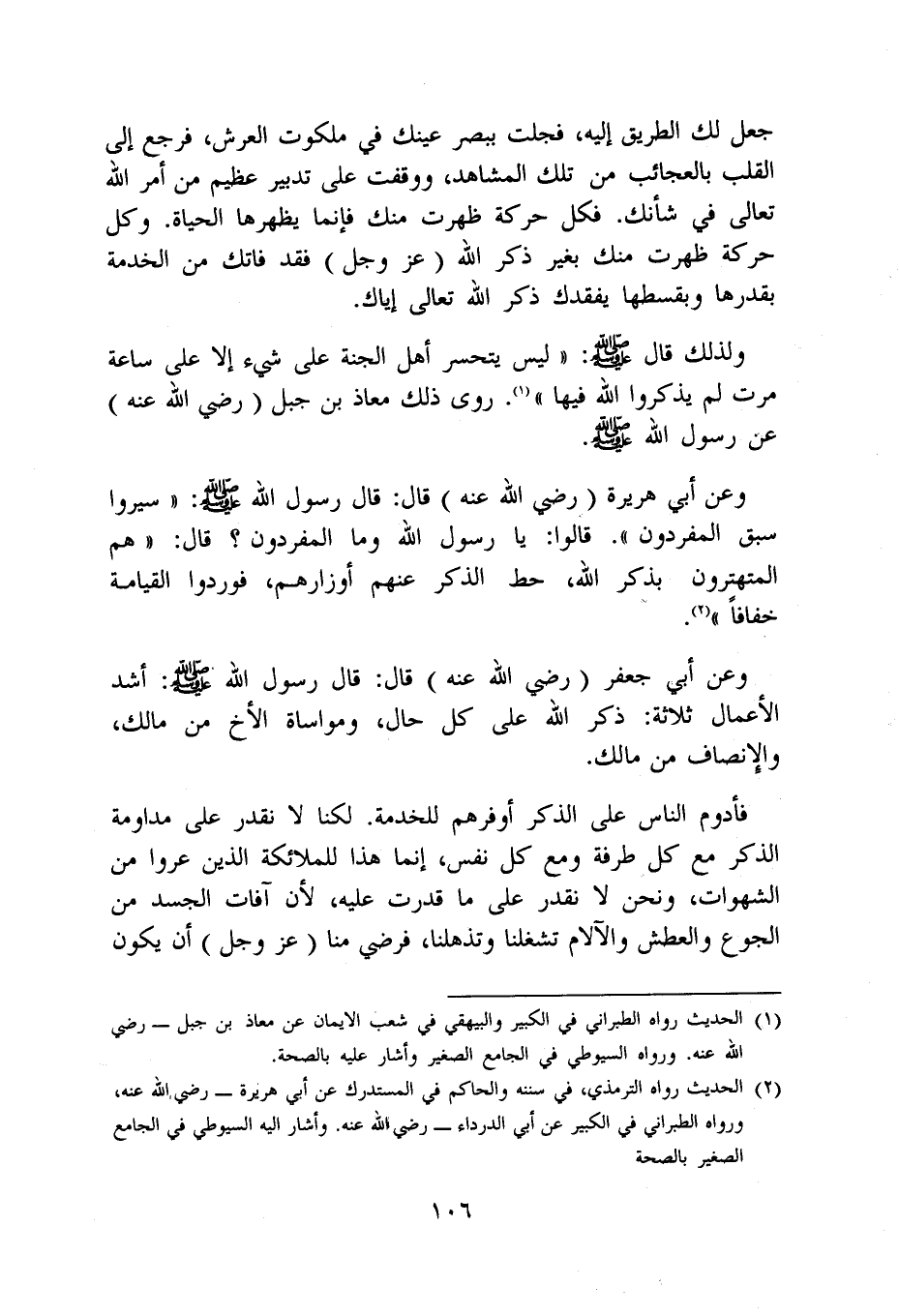 فأدوم النَّاس على الذّكر أوفرهم للْخدمَة لَكنا لَا نقدر على مداومة الذّكر مَعَ كل طرفَة وَمَعَ كل نفس إِنَّمَا هَذَا للْمَلَائكَة الَّذين عروا من الشَّهَوَات وَنحن لَا نقدر على مَا قدرت عَلَيْهِ لِأَن آفَات الْجَسَد من الْجُوع والعطش والآلام تشغلنا وتذهلنا فَرضِي منا عز وَجل أَن يكون