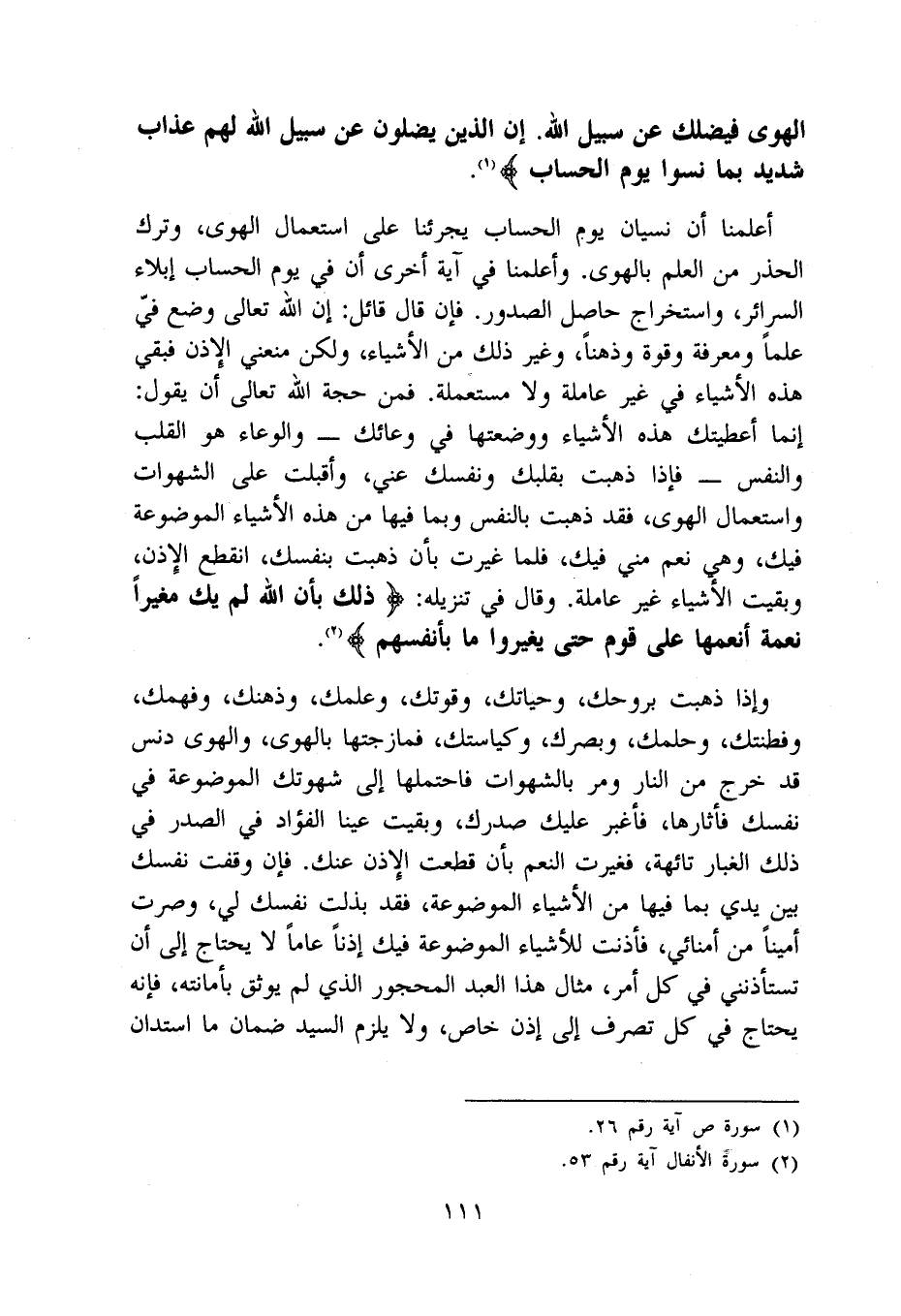 وَإِذا ذهبت بروحك وحياتك وقوتك وعلمك وذهنك وفهمك وفطنتك وحلمك وبصرك وكياستك فمازجتها بالهوى والهوى دنس قد خرج من النَّار وَمر بالشهوات فاحتملها إِلَى شهوتك الْمَوْضُوعَة فِي نَفسك فأثارها فأغبر عَلَيْك صدرك وَبقيت عينا الْفُؤَاد فِي الصَّدْر فِي ذَلِك الْغُبَار تائهة فغيرت النعم بِأَن قطعت الْإِذْن عَنْك فَإِن وقفت نَفسك بَين يَدي بِمَا فِيهَا من الْأَشْيَاء الْمَوْضُوعَة فقد بذلت نَفسك لي وصرت أَمينا من أمنائي فَأَذنت للأشياء الْمَوْضُوعَة فِيك إِذْنا عَاما لَا يحْتَاج إِلَى أَن تستأذنني فِي كل أَمر مِثَال هَذَا العَبْد الْمَحْجُور الَّذِي لم يوثق بأمانته فَإِنَّهُ يحْتَاج فِي كل تصرف إِلَى إِذن خَاص وَلَا يلْزم السَّيِّد ضَمَان مَا اسْتَدَانَ