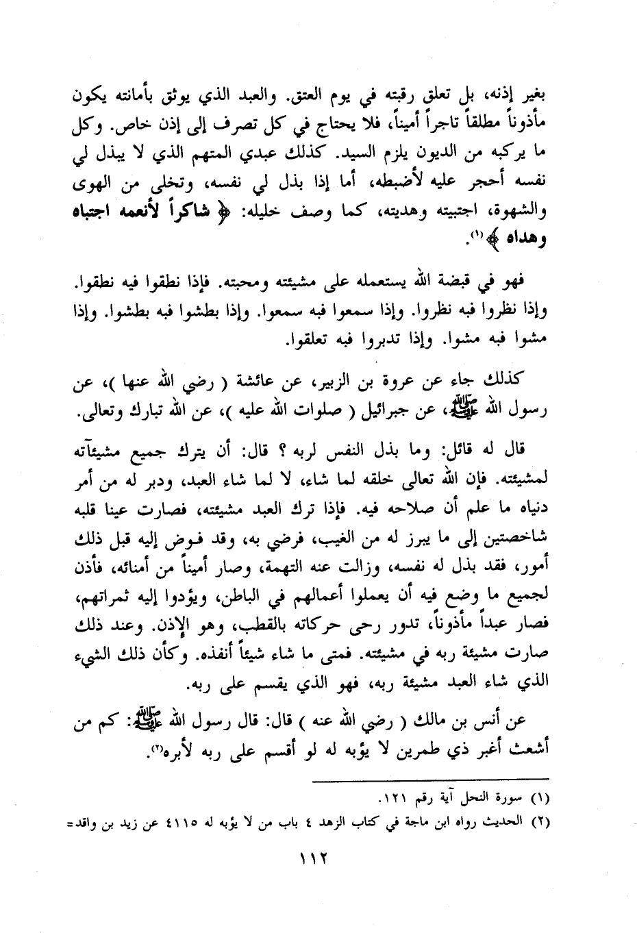 بِغَيْر إِذْنه بل تعلق رقبته فِي يَوْم الْعتْق وَالْعَبْد الَّذِي يوثق بأمانته يكون مَأْذُونا مُطلقًا تَاجِرًا أَمينا فَلَا يحْتَاج فِي كل تصرف إِلَى إِذن خَاص وكل مَا يركبه من الدُّيُون يلْزم السَّيِّد كَذَلِك عَبدِي الْمُتَّهم الَّذِي لَا يبْذل لي نَفسه أحجر عَلَيْهِ لأضبطه أما إِذا بذل لي نَفسه وتخلى من الْهوى والشهوة اجتبيته وهديته كَمَا وصف خَلِيله {شاكرا لأنعمه اجتباه وهداه} فَهُوَ فِي قَبْضَة الله يَسْتَعْمِلهُ على مَشِيئَته ومحبته فَإِذا نطقوا فِيهِ نطقوا وَإِذا نظرُوا فبه نظرُوا وَإِذا سمعُوا فبه سمعُوا وَإِذا بطشوا فبه بطشوا وَإِذا مَشوا فبه مَشوا وَإِذا تدبروا فبه تعلقوا