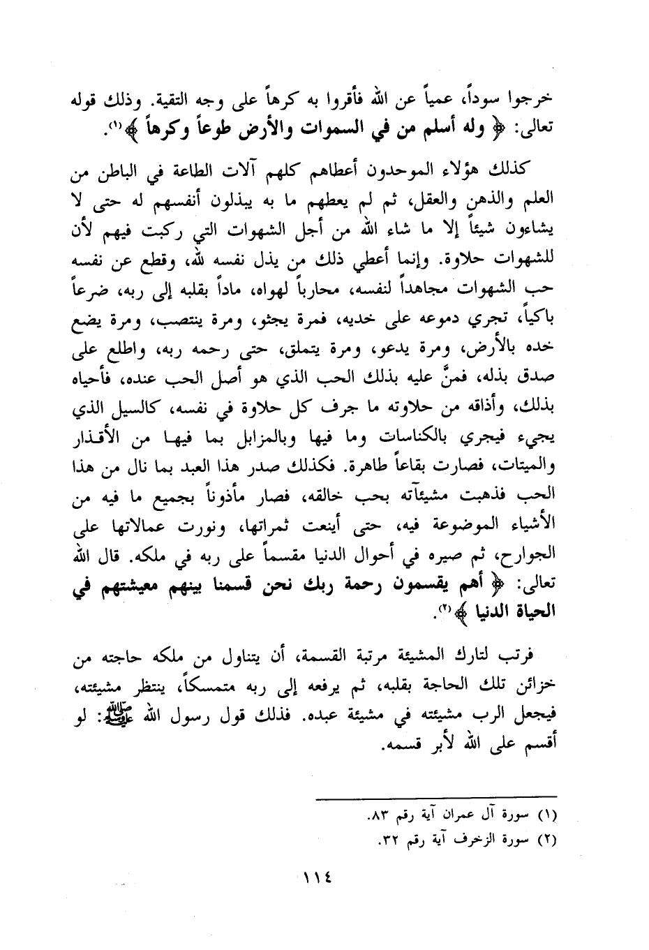 كَذَلِك هَؤُلَاءِ الموحدون أَعْطَاهُم كلهم آلَات الطَّاعَة فِي الْبَاطِن من الْعلم والذهن وَالْعقل ثمَّ لم يعطهم مَا بِهِ يبذلون أنفسهم لَهُ حَتَّى لَا يشاءون شَيْئا إِلَّا مَا شَاءَ الله من أجل الشَّهَوَات الَّتِي ركبت فيهم لِأَن للشهوات حلاوة وَإِنَّمَا أعطي ذَلِك من يذل نَفسه لله وَقطع عَن نَفسه حب الشَّهَوَات مُجَاهدًا لنَفسِهِ مُحَاربًا لهواه مَادًّا بِقَلْبِه إِلَى ربه ضرعا باكيا تجْرِي دُمُوعه على خديه فَمرَّة يجثو وَمرَّة ينْتَصب وَمرَّة يضع خَدّه بِالْأَرْضِ وَمرَّة يَدْعُو وَمرَّة يتملق حَتَّى رَحمَه ربه واطلع على صدق بذله فَمن عَلَيْهِ بذلك الْحبّ الَّذِي هُوَ أصل الْحبّ عِنْده فأحياه بذلك وأذاقه من حلاوته مَا جرف كل حلاوة فِي نَفسه كالسيل الَّذِي يَجِيء فَيجْرِي بالكناسات وَمَا فِيهَا وبالمزابل بِمَا فِيهَا من الأقذار وَالْمَيتَات فَصَارَت بقاعا طَاهِرَة فَكَذَلِك صدر هَذَا العَبْد بِمَا نَالَ من هَذَا الْحبّ فَذَهَبت مشيئآته بحب خالقه فَصَارَ مَأْذُونا بِجَمِيعِ مَا فِيهِ من الْأَشْيَاء الْمَوْضُوعَة فِيهِ حَتَّى أينعت ثمراتها ونورت عمالاتها على الْجَوَارِح ثمَّ صيره فِي أَحْوَال الدُّنْيَا مقسمًا على ربه فِي ملكه قَالَ الله تَعَالَى {أهم يقسمون رَحْمَة رَبك نَحن قسمنا بَينهم معيشتهم فِي الْحَيَاة الدُّنْيَا}