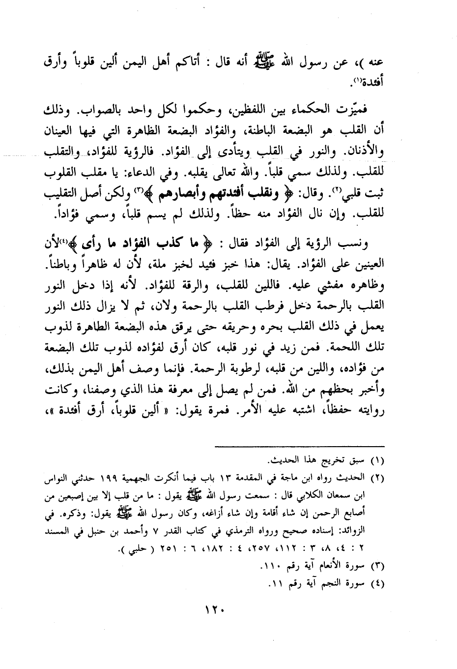 وَنسب الرُّؤْيَة إِلَى الْفُؤَاد فَقَالَ {مَا كذب الْفُؤَاد مَا رأى} لِأَن الْعَينَيْنِ على الْفُؤَاد يُقَال هَذَا خبز فئيد لخبز مِلَّة لِأَن لَهُ ظَاهرا وَبَاطنا وَظَاهره مفشي عَلَيْهِ فاللين للقلب والرقة للفؤاد لِأَنَّهُ إِذا دخل النُّور الْقلب بِالرَّحْمَةِ دخل فرطب الْقلب بِالرَّحْمَةِ ولان ثمَّ لَا يزَال ذَلِك النُّور يعْمل فِي ذَلِك الْقلب بحره وحريقه حَتَّى يرقق هَذِه الْبضْعَة الطاهرة لذوب تِلْكَ اللحمة فَمن زيد فِي نور قلبه كَانَ أرق لفؤاده لذوب تِلْكَ الْبضْعَة من فُؤَاده واللين من قلبه لرطوبة الرَّحْمَة فَإِنَّمَا وصف أهل الْيمن بذلك وَأخْبر بحظهم من الله فَمن لم يصل إِلَى معرفَة هَذَا الَّذِي وَصفنَا وَكَانَت رِوَايَته حفظا اشْتبهَ عَلَيْهِ الْأَمر فَمرَّة يَقُول أَلين قلوبا أرق أَفْئِدَة