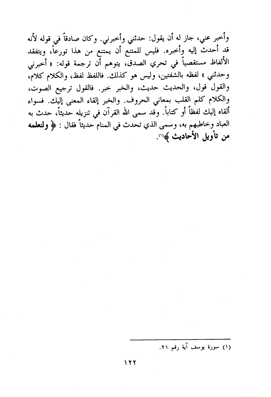 وَأخْبر عني جَازَ لَهُ أَن يَقُول حَدثنِي وَأَخْبرنِي وَكَانَ صَادِقا فِي قَوْله لِأَنَّهُ قد أحدث إِلَيْهِ وَأخْبرهُ فَلَيْسَ للممتنع أَن يمْتَنع من هَذَا تورعا ويتفقد الْأَلْفَاظ مستقصيا فِي تحري الصدْق يتَوَهَّم أَن تَرْجَمَة قَوْله أَخْبرنِي وحَدثني لَفظه بالشفتين وَلَيْسَ هُوَ كَذَلِك فاللفظ لفظ وَالْكَلَام كَلَام وَالْقَوْل قَول والْحَدِيث حَدِيث وَالْخَبَر خبر فَالْقَوْل تَرْجِيع الصَّوْت وَالْكَلَام كلم الْقلب بمعاني الْحُرُوف وَالْخَبَر إِلْقَاء الْمَعْنى إِلَيْك فَسَوَاء أَلْقَاهُ إِلَيْك لفظا أَو كتابا وَقد سمى الله الْقُرْآن فِي تَنْزِيله حَدِيثا حدث بِهِ الْعباد وخاطبهم بِهِ وسمى الَّذِي تحدث فِي الْمَنَام حَدِيثا فَقَالَ {ولنعلمه من تَأْوِيل الْأَحَادِيث}
