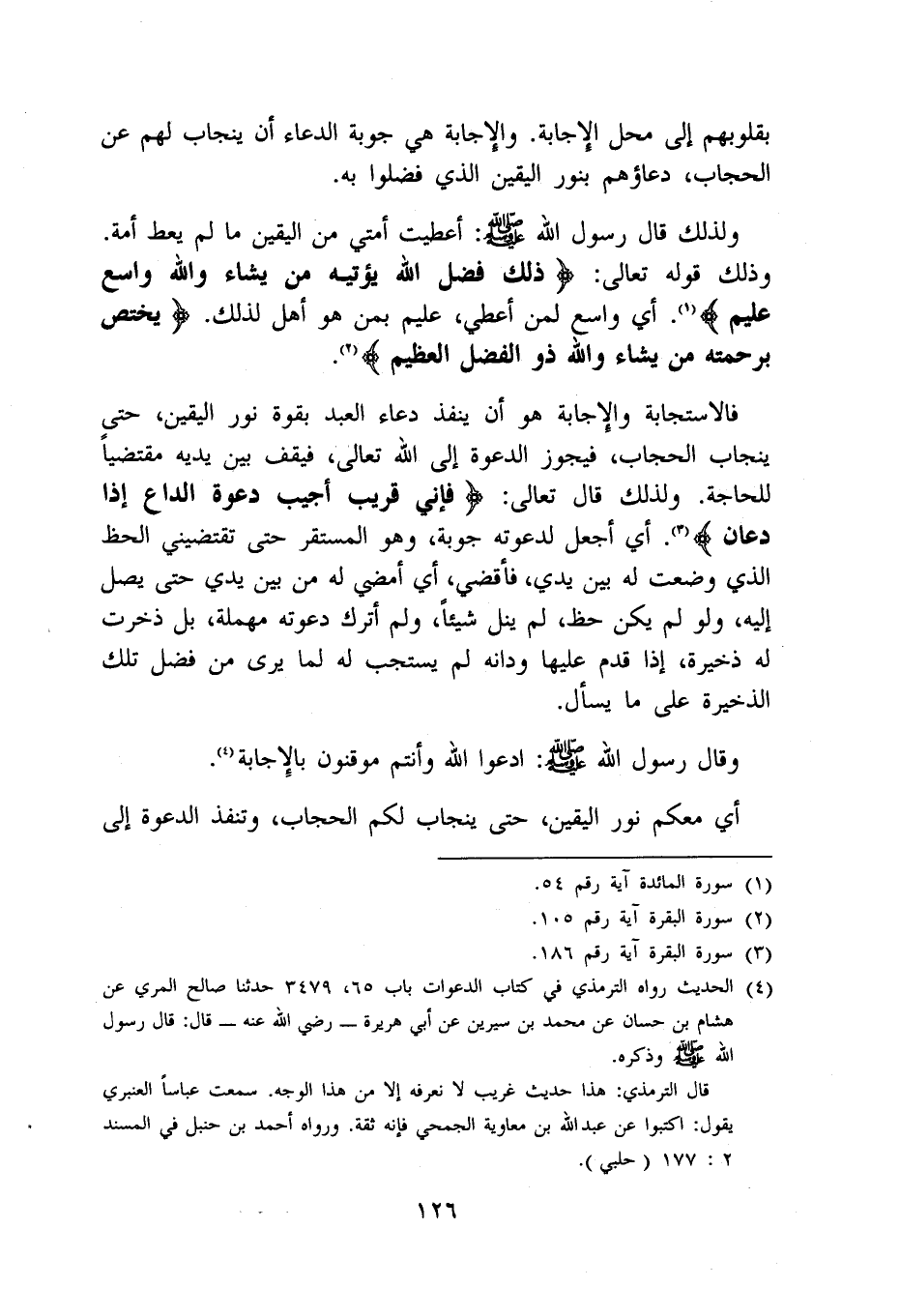 فالاستجابة والإجابة هُوَ أَن ينفذ دُعَاء العَبْد بِقُوَّة نور الْيَقِين حَتَّى ينجاب الْحجاب فَيجوز الدعْوَة إِلَى الله تَعَالَى فيقف بَين يَدَيْهِ مقتضيا للْحَاجة وَلذَلِك قَالَ تَعَالَى {فَإِنِّي قريب أُجِيب دَعْوَة الداع إِذا دعان} أَي أجعَل لدعوته جوبة وَهُوَ المستقر حَتَّى تقتضيني الْحَظ الَّذِي وضعت لَهُ بَين يَدي فأقضي أَي أمضي لَهُ من بَين يَدي حَتَّى يصل إِلَيْهِ وَلَو لم يكن حَظّ لم ينل شَيْئا وَلم أترك دَعوته مُهْملَة بل ذخرت لَهُ ذخيرة إِذا قدم عَلَيْهَا ودانه لم يستجب لَهُ لما يرى من فضل تِلْكَ الذَّخِيرَة على مَا يسْأَل