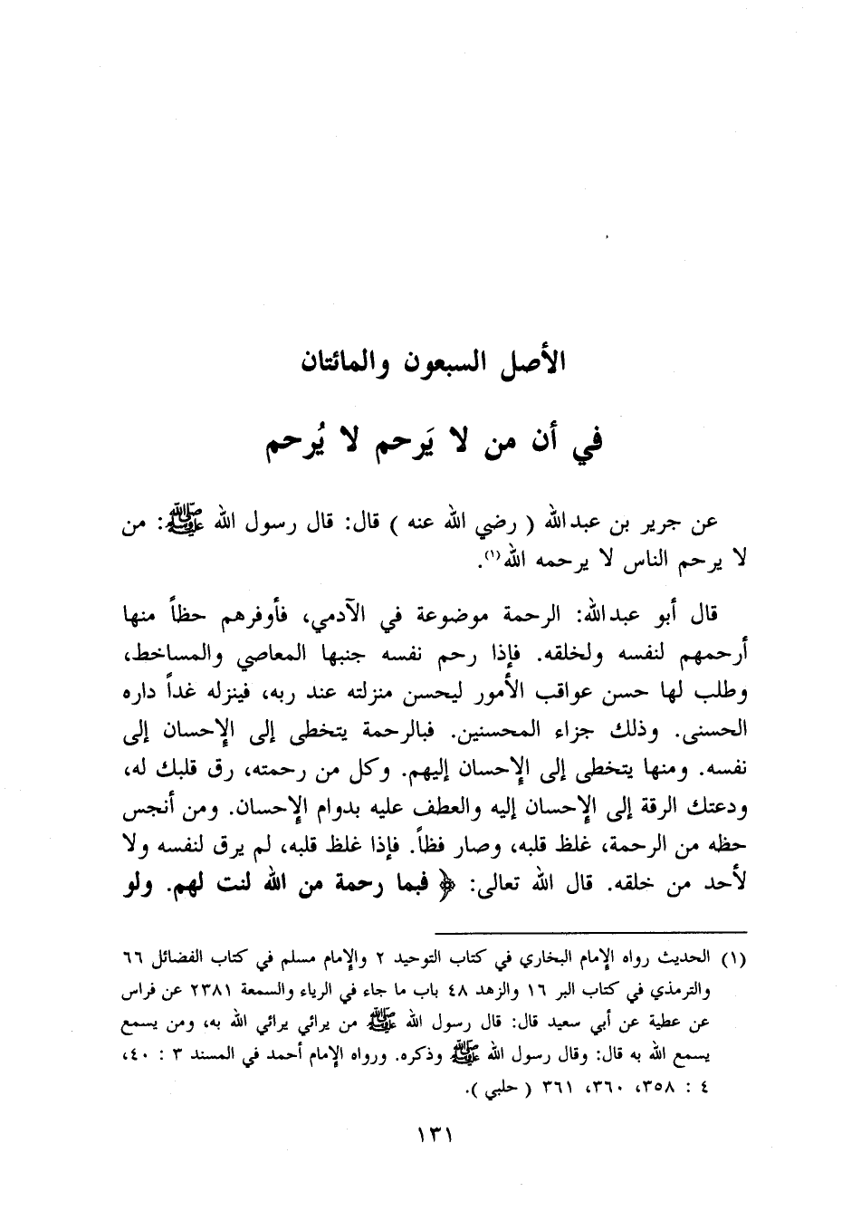 عَن جرير بن عبد الله رَضِي الله عَنهُ قَالَ قَالَ رَسُول الله صلى الله عَلَيْهِ وَسلم من لَا يرحم النَّاس لَا يرحمه الله