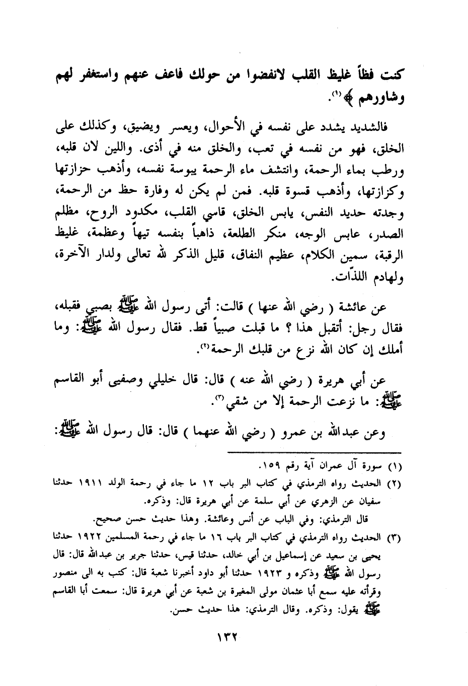 عَن عَائِشَة رَضِي الله عَنْهَا قَالَت أَتَى رَسُول الله صلى الله عَلَيْهِ وَسلم بصبي فَقبله فَقَالَ رجل أتقبل هَذَا مَا قبلت صَبيا قطّ فَقَالَ رَسُول الله صلى الله عَلَيْهِ وَسلم وَمَا أملك إِن كَانَ الله نزع من قَلْبك الرَّحْمَة