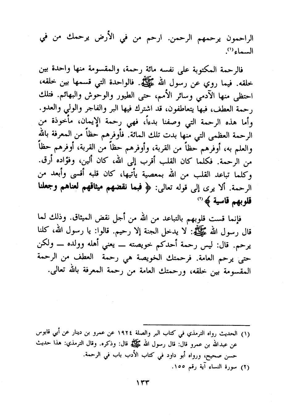 فالرحمة الْمَكْتُوبَة على نَفسه مائَة رَحْمَة والمقسومة مِنْهَا وَاحِدَة بَين خلقه فِيمَا رُوِيَ عَن رَسُول الله صلى الله عَلَيْهِ وَسلم فالواحدة الَّتِي قسمهَا بَين خلقه احتظى مِنْهَا الْآدَمِيّ وَسَائِر الْأُمَم حَتَّى الطُّيُور والوحوش والبهائم فَتلك رَحْمَة الْعَطف فبها يتعاطفون قد اشْترك فِيهَا البرر والفاجر وَالْوَلِيّ والعدو وَأما هَذِه الرَّحْمَة الَّتِي وَصفنَا بدءا فَهِيَ رَحْمَة الْإِيمَان مَأْخُوذَة من الرَّحْمَة الْعُظْمَى الَّتِي مِنْهَا بَدَت تِلْكَ الْمِائَة فأوفرهم حظا من الْمعرفَة بِاللَّه وَالْعلم بِهِ أوفرهم حظا من الْقرْبَة وأوفرهم حظا من الْقرْبَة أوفرهم حظا من الرَّحْمَة فَكلما كَانَ الْقلب أقرب إِلَى الله كَانَ أَلين وفؤاده أرق وَكلما تبَاعد الْقلب من الله بِمَعْصِيَة يَأْتِيهَا كَانَ قلبه أقسى وَأبْعد من الرَّحْمَة أَلا يرى إِلَى قَوْله تَعَالَى {فبمَا نقضهم ميثاقهم لعناهم وَجَعَلنَا قُلُوبهم قاسية}