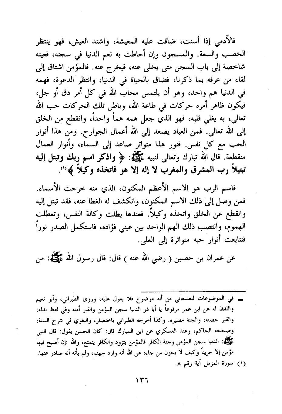 فالآدمي إِذا أَسِنَت ضَاقَتْ عَلَيْهِ الْمَعيشَة وَاشْتَدَّ الْعَيْش فَهُوَ ينْتَظر الخصب وَالسعَة والمسجون وَإِن أحاطت بِهِ نعم الدُّنْيَا فِي سجنه فعينه شاخصة إِلَى بَاب السجْن مَتى يخلى عَنهُ فَيخرج عَنهُ فالمؤمن اشتاق إِلَى لِقَاء من عرفه بِمَا ذكرنَا فَضَاقَ بِالْحَيَاةِ فِي الدُّنْيَا وانتظر الدعْوَة فهمه فِي الدُّنْيَا هم وَاحِد وَهُوَ أَن يلْتَمس محاب الله فِي كل أَمر دق أَو جلّ فَيكون ظَاهر أمره حركات فِي طَاعَة الله وباطن تِلْكَ الحركات حب الله تَعَالَى بِهِ يغلي قلبه فَهُوَ الَّذِي جعل همه هما وَاحِدًا وَانْقطع من الْخلق إِلَى الله تَعَالَى فَمن الْعباد يصعد إِلَى الله أَعمال الْجَوَارِح وَمن هَذَا أنوار الْحبّ مَعَ كل نفس فنور هَذَا متواتر صاعد إِلَى السَّمَاء وأنوار الْعمَّال مُنْقَطِعَة قَالَ الله تبَارك وَتَعَالَى صلى الله عَلَيْهِ وَسلم {وَاذْكُر اسْم رَبك وتبتل إِلَيْهِ تبتيلا رب الْمشرق وَالْمغْرب لَا إِلَه إِلَّا هُوَ فاتخذه وَكيلا}