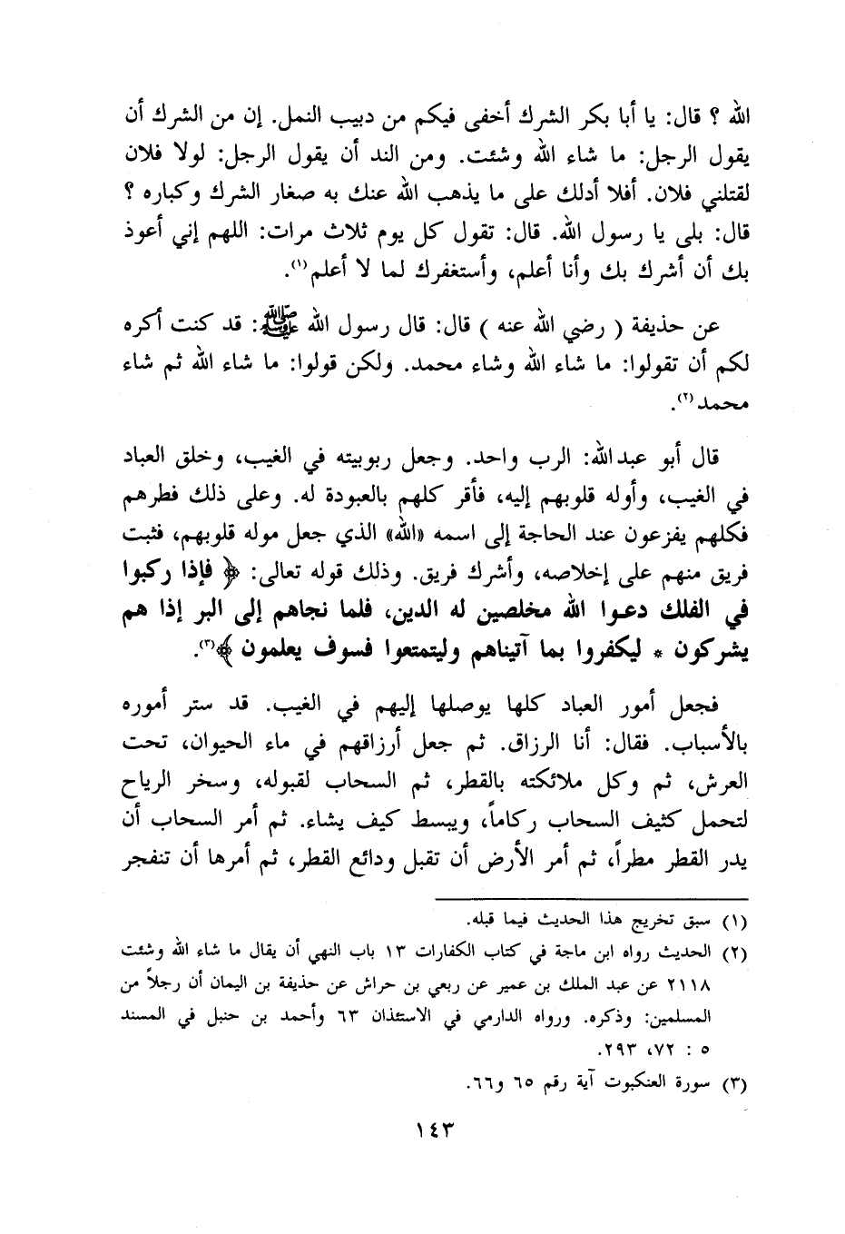 الله قَالَ يَا أَبَا بكر الشّرك أخْفى فِيكُم من دَبِيب النَّمْل إِن من الشّرك أَن يَقُول الرجل مَا شَاءَ الله وشئت وَمن الند أَن يَقُول الرجل لَوْلَا فلَان لَقَتَلَنِي فلَان أَفلا أدلك على مَا يذهب الله عَنْك بِهِ صغَار الشّرك وكباره قَالَ بلَى يَا رَسُول الله قَالَ تَقول كل يَوْم ثَلَاث مَرَّات اللَّهُمَّ إِنِّي أعوذ بك أَن أشرك بك وَأَنا أعلم وأستغفرك لما لَا أعلم