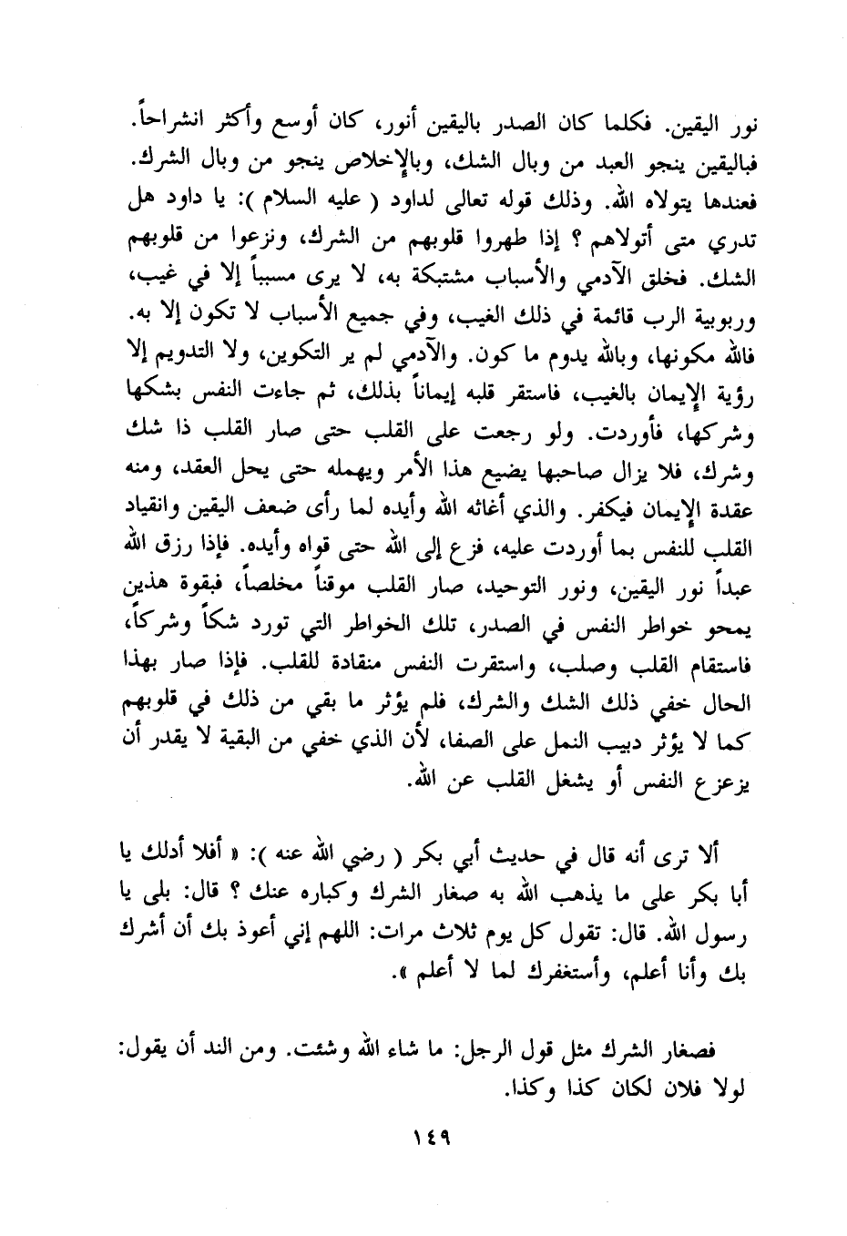 نور الْيَقِين فَكلما كَانَ الصَّدْر بِالْيَقِينِ أنور كَانَ أوسع وَأكْثر انشراحا فباليقين ينجو العَبْد من وبال الشَّك وبالإخلاص ينجو من وبال الشّرك فَعندهَا يَتَوَلَّاهُ الله وَذَلِكَ قَوْله تَعَالَى لداود عَلَيْهِ السَّلَام يَا دَاوُد هَل تَدْرِي مَتى أتولاهم إِذا طهروا قُلُوبهم من الشّرك ونزعوا من قُلُوبهم الشَّك فخلق الْآدَمِيّ والأسباب مشتبكة بِهِ لَا يرى مسببا إِلَّا فِي غيب وربوبية الرب قَائِمَة فِي ذَلِك الْغَيْب وَفِي جَمِيع الْأَسْبَاب لَا تكون إِلَّا بِهِ فَالله مكونها وَبِاللَّهِ يَدُوم مَا كَون والآدمي لم ير التكوين وَلَا التدويم إِلَّا رُؤْيَة الْإِيمَان بِالْغَيْبِ فاستقر قلبه إِيمَانًا بذلك ثمَّ جَاءَت النَّفس بشكها وشركها فأوردت وَلَو رجعت على الْقلب حَتَّى صَار الْقلب ذَا شكّ وشرك فَلَا يزَال صَاحبهَا يضيع هَذَا الْأَمر ويهمله حَتَّى يحل العقد وَمِنْه عقدَة الْإِيمَان فيكفر وَالَّذِي أغاثه الله وأيده لما رأى ضعف الْيَقِين وانقياد الْقلب للنَّفس بِمَا أوردت عَلَيْهِ فزع إِلَى الله حَتَّى قواه وأيده فَإِذا رزق الله عبدا نور الْيَقِين وَنور التَّوْحِيد صَار الْقلب موقنا مخلصا فبقوة هذَيْن يمحو خواطر النَّفس فِي الصَّدْر تِلْكَ الخواطر الَّتِي تورد شكا وشركا فاستقام الْقلب وصلب واستقرت النَّفس منقادة للقلب فَإِذا صَار بِهَذَا الْحَال خَفِي ذَلِك الشَّك والشرك فَلم يُؤثر مَا بَقِي من ذَلِك فِي قُلُوبهم كَمَا لَا يُؤثر دَبِيب النَّمْل على الصَّفَا لِأَن الَّذِي خَفِي من الْبَقِيَّة لَا يقدر أَن يزعزع النَّفس أَو يشغل الْقلب عَن الله