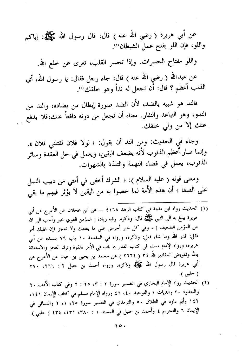 وَجَاء فِي الحَدِيث وَمن الند أَن يَقُول لَوْلَا فلَان لَقَتَلَنِي فلَان وَإِنَّمَا صَار أعظم الذُّنُوب لِأَنَّهُ يضعف الْيَقِين وَيعْمل فِي حل الْعقْدَة وَسَائِر الذُّنُوب يعْمل فِي قَضَاء النهمة والتلذذ بالشهوات